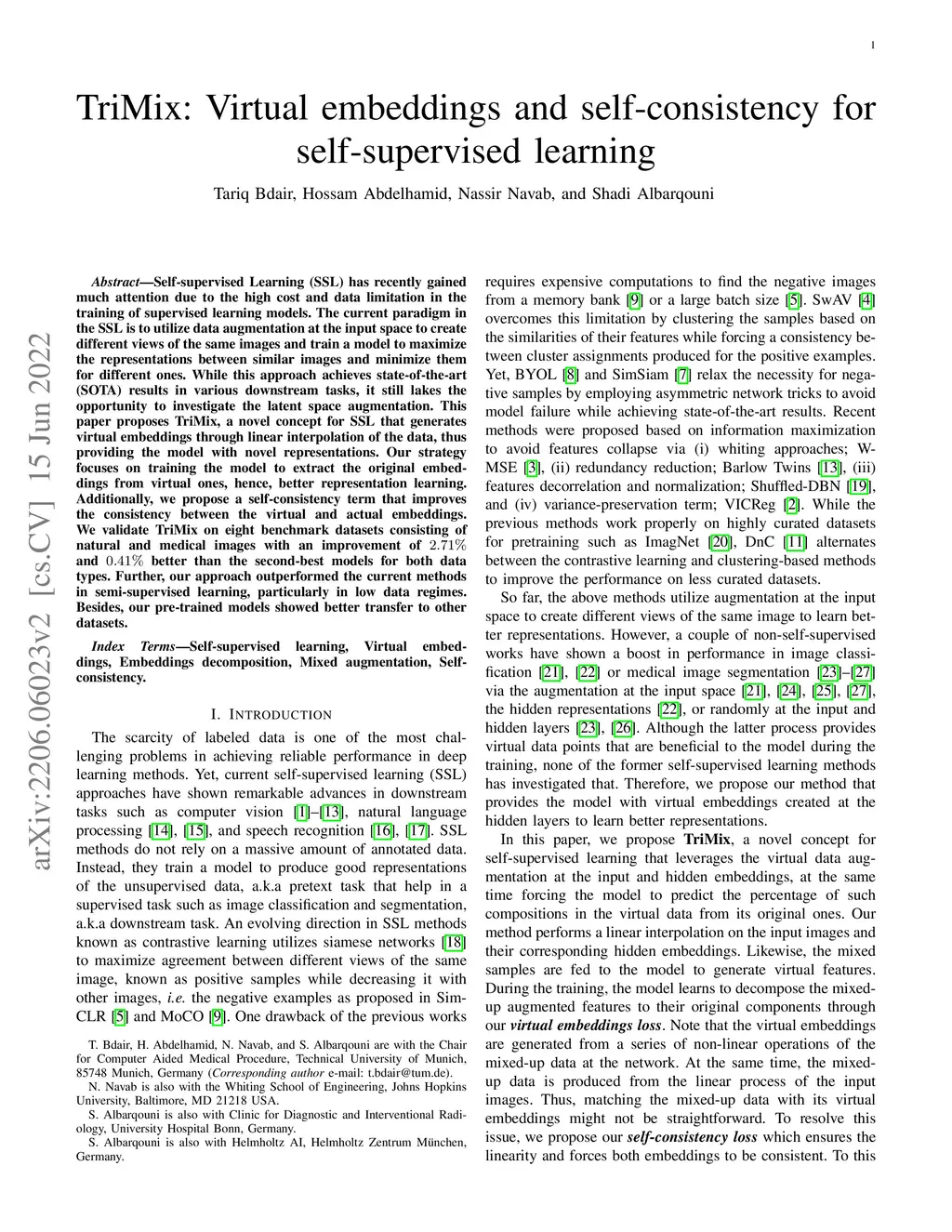 Self-supervised Learning (SSL) has recently gained much attention due to the high cost and data limitation in the training of supervised learning models. The current paradigm in the SSL is to utilize data augmentation at the input space to create different views of the same images and train a model to maximize the representations between similar images and minimize them for different ones. While this approach achieves state-of-the-art (SOTA) results in various downstream tasks, it still lakes the opportunity to investigate the latent space augmentation. This paper proposes TriMix, a novel concept for SSL that generates virtual embeddings through linear interpolation of the data, thus providing the model with novel representations. Our strategy focuses on training the model to extract the original embeddings from virtual ones, hence, better representation learning. Additionally, we propose a self-consistency term that improves the consistency between the virtual and actual embeddings. We validate TriMix on eight benchmark datasets consisting of natural and medical images with an improvement of 2.71% and 0.41% better than the second-best models for both data types. Further, our approach outperformed the current methods in semi-supervised learning, particularly in low data regimes. Besides, our pre-trained models showed better transfer to other datasets.