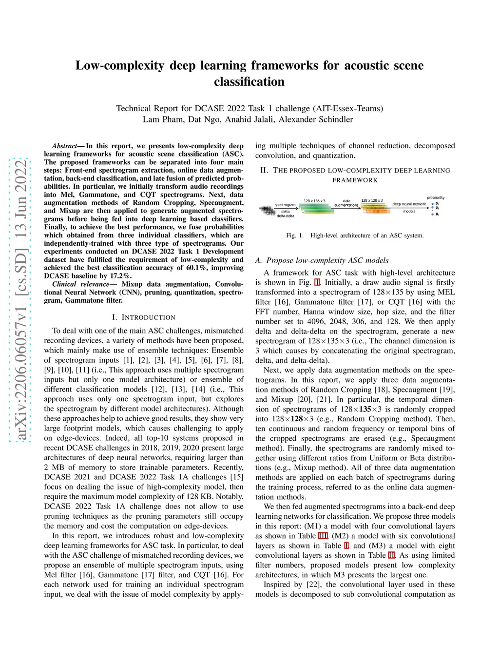 In this report, we presents low-complexity deep learning frameworks for acoustic scene classification (ASC). The proposed frameworks can be separated into four main steps: Front-end spectrogram extraction, online data augmentation, back-end classification, and late fusion of predicted probabilities. In particular, we initially transform audio recordings into Mel, Gammatone, and CQT spectrograms. Next, data augmentation methods of Random Cropping, Specaugment, and Mixup are then applied to generate augmented spectrograms before being fed into deep learning based classifiers. Finally, to achieve the best performance, we fuse probabilities which obtained from three individual classifiers, which are independently-trained with three type of spectrograms. Our experiments conducted on DCASE 2022 Task 1 Development dataset have fullfiled the requirement of low-complexity and achieved the best classification accuracy of 60.1%, improving DCASE baseline by 17.2%.