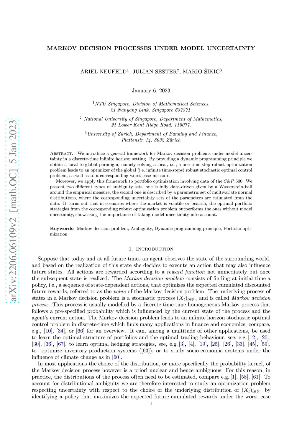 We introduce a general framework for Markov decision problems under model uncertainty in a discrete-time infinite horizon setting. By providing a dynamic programming principle we obtain a local-to-global paradigm, namely solving a local, i.e., a one time-step robust optimization problem leads to an optimizer of the global (i.e. infinite time-steps) robust stochastic optimal control problem, as well as to a corresponding worst-case measure. Moreover, we apply this framework to portfolio optimization involving data of the S&P 500. We present two different types of ambiguity sets; one is fully data-driven given by a Wasserstein-ball around the empirical measure, the second one is described by a parametric set of multivariate normal distributions, where the corresponding uncertainty sets of the parameters are estimated from the data. It turns out that in scenarios where the market is volatile or bearish, the optimal portfolio strategies from the corresponding robust optimization problem outperforms the ones without model uncertainty, showcasing the importance of taking model uncertainty into account.