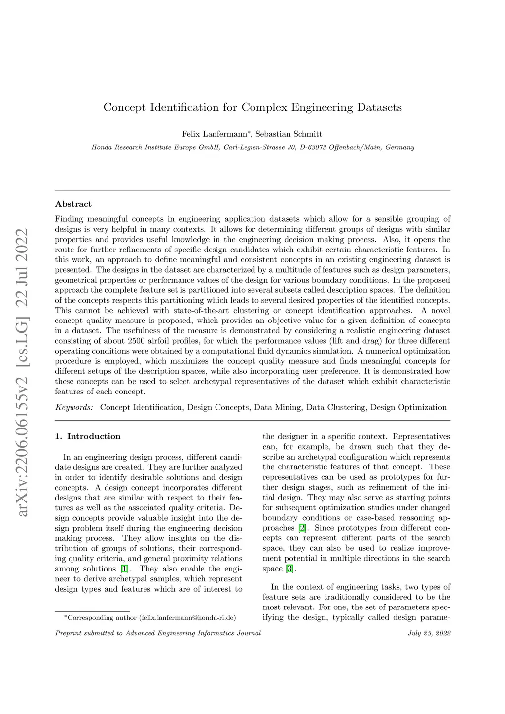 Finding meaningful concepts in engineering application datasets which allow for a sensible grouping of designs is very helpful in many contexts. It allows for determining different groups of designs with similar properties and provides useful knowledge in the engineering decision making process. Also, it opens the route for further refinements of specific design candidates which exhibit certain characteristic features. In this work, an approach to define meaningful and consistent concepts in an existing engineering dataset is presented. The designs in the dataset are characterized by a multitude of features such as design parameters, geometrical properties or performance values of the design for various boundary conditions. In the proposed approach the complete feature set is partitioned into several subsets called description spaces. The definition of the concepts respects this partitioning which leads to several desired properties of the identified concepts. This cannot be achieved with state-of-the-art clustering or concept identification approaches. A novel concept quality measure is proposed, which provides an objective value for a given definition of concepts in a dataset. The usefulness of the measure is demonstrated by considering a realistic engineering dataset consisting of about 2500 airfoil profiles, for which the performance values (lift and drag) for three different operating conditions were obtained by a computational fluid dynamics simulation. A numerical optimization procedure is employed, which maximizes the concept quality measure and finds meaningful concepts for different setups of the description spaces, while also incorporating user preference. It is demonstrated how these concepts can be used to select archetypal representatives of the dataset which exhibit characteristic features of each concept.