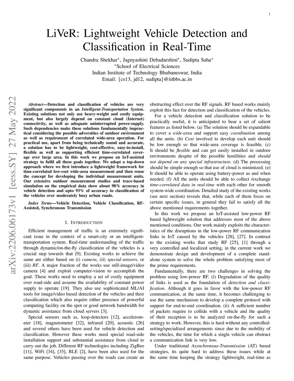 Detection and classification of vehicles are very significant components in an Intelligent-Transportation System. Existing solutions not only use heavy-weight and costly equipment, but also largely depend on constant cloud (Internet) connectivity, as well as adequate uninterrupted power-supply. Such dependencies make these solutions fundamentally impractical considering the possible adversities of outdoor environment as well as requirement of correlated wide-area operation. For practical use, apart from being technically sound and accurate, a solution has to be lightweight, cost-effective, easy-to-install, flexible as well as supporting efficient time-correlated coverage over large area. In this work we propose an IoT-assisted strategy to fulfil all these goals together. We adopt a top-down approach where we first introduce a lightweight framework for time-correlated low-cost wide-area measurement and then reuse the concept for developing the individual measurement units. Our extensive outdoor measurement studies and trace-based simulation on the empirical data show about 98% accuracy in vehicle detection and upto 93% of accuracy in classification of the vehicles over moderately busy urban roads.