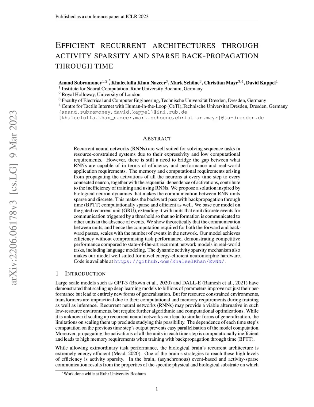 Recurrent neural networks (RNNs) are well suited for solving sequence tasks in resource-constrained systems due to their expressivity and low computational requirements. However, there is still a need to bridge the gap between what RNNs are capable of in terms of efficiency and performance and real-world application requirements. The memory and computational requirements arising from propagating the activations of all the neurons at every time step to every connected neuron, together with the sequential dependence of activations, contribute to the inefficiency of training and using RNNs. We propose a solution inspired by biological neuron dynamics that makes the communication between RNN units sparse and discrete. This makes the backward pass with backpropagation through time (BPTT) computationally sparse and efficient as well. We base our model on the gated recurrent unit (GRU), extending it with units that emit discrete events for communication triggered by a threshold so that no information is communicated to other units in the absence of events. We show theoretically that the communication between units, and hence the computation required for both the forward and backward passes, scales with the number of events in the network. Our model achieves efficiency without compromising task performance, demonstrating competitive performance compared to state-of-the-art recurrent network models in real-world tasks, including language modeling. The dynamic activity sparsity mechanism also makes our model well suited for novel energy-efficient neuromorphic hardware. Code is available at https://github.com/KhaleelKhan/EvNN/.