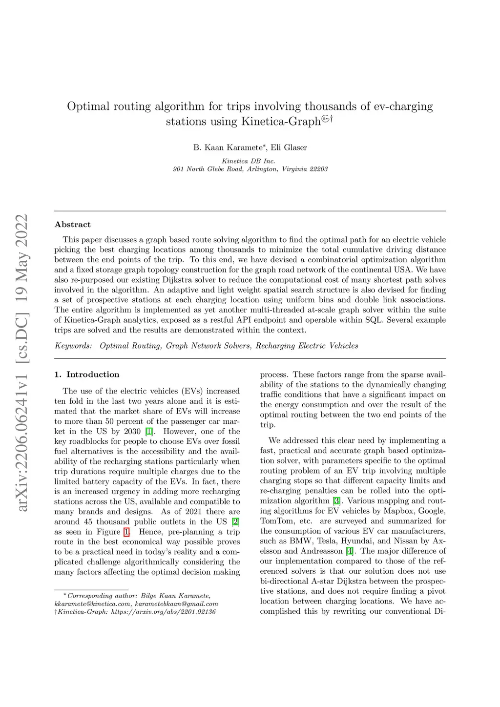 This paper discusses a graph based route solving algorithm to find the optimal path for an electric vehicle picking the best charging locations among thousands to minimize the total cumulative driving distance between the end points of the trip. To this end, we have devised a combinatorial optimization algorithm and a fixed storage graph topology construction for the graph road network of the continental USA. We have also re-purposed our existing Dijkstra solver to reduce the computational cost of many shortest path solves involved in the algorithm. An adaptive and light weight spatial search structure is also devised for finding a set of prospective stations at each charging location using uniform bins and double link associations. The entire algorithm is implemented as yet another multi-threaded at-scale graph solver within the suite of Kinetica-Graph analytics, exposed as a restful API endpoint and operable within SQL. Several example trips are solved and the results are demonstrated within the context.