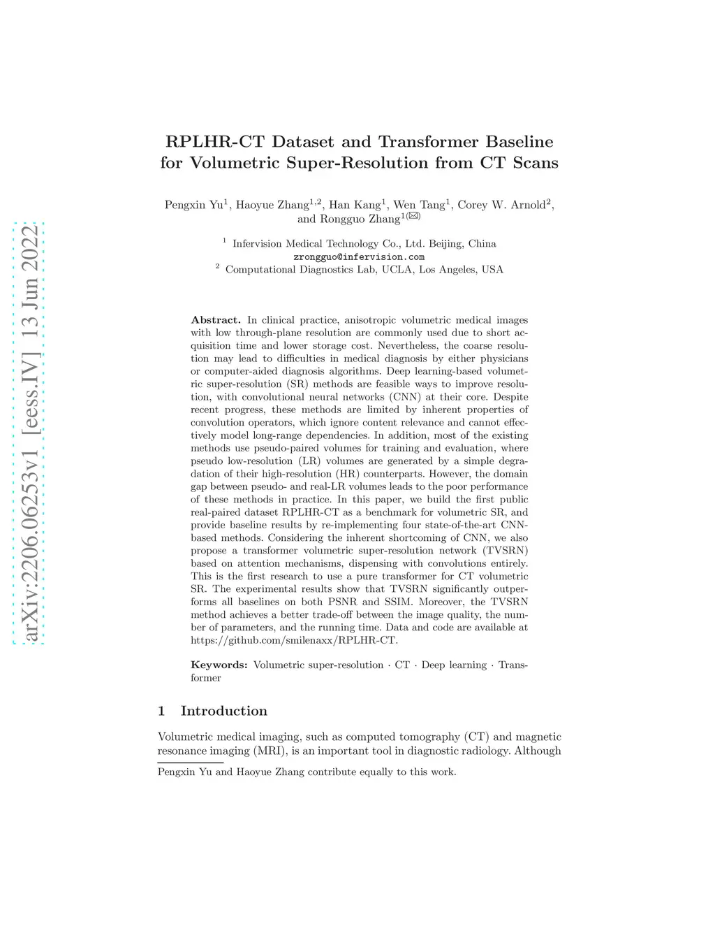 RPLHR-CT Dataset and Transformer Baseline for Volumetric