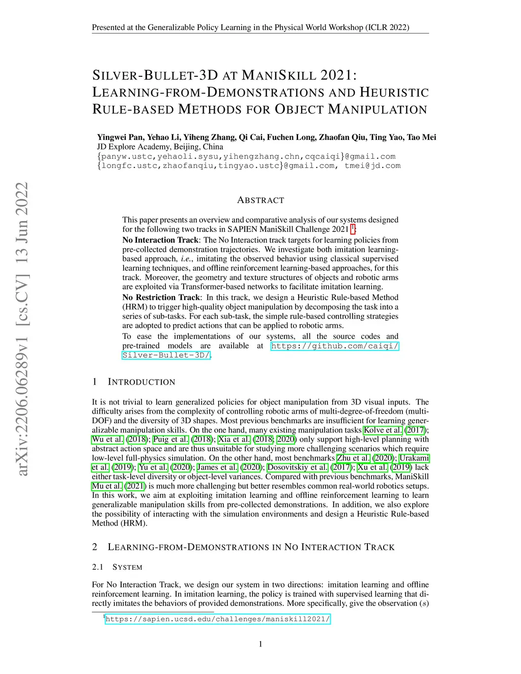 This paper presents an overview and comparative analysis of our systems designed for the following two tracks in SAPIEN ManiSkill Challenge 2021: No Interaction Track: The No Interaction track targets for learning policies from pre-collected demonstration trajectories. We investigate both imitation learning-based approach, i.e., imitating the observed behavior using classical supervised learning techniques, and offline reinforcement learning-based approaches, for this track. Moreover, the geometry and texture structures of objects and robotic arms are exploited via Transformer-based networks to facilitate imitation learning. No Restriction Track: In this track, we design a Heuristic Rule-based Method (HRM) to trigger high-quality object manipulation by decomposing the task into a series of sub-tasks. For each sub-task, the simple rule-based controlling strategies are adopted to predict actions that can be applied to robotic arms. To ease the implementations of our systems, all the source codes and pre-trained models are available at \url{https://github.com/caiqi/Silver-Bullet-3D/}.