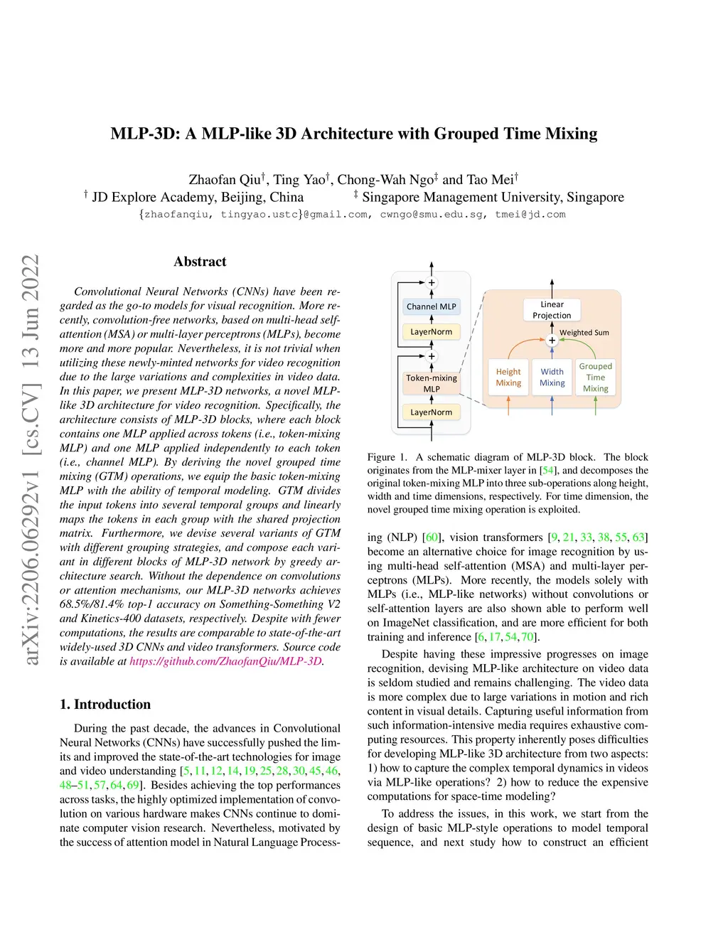 MLP-3D: A MLP-like 3D Architecture with Grouped Time Mixing