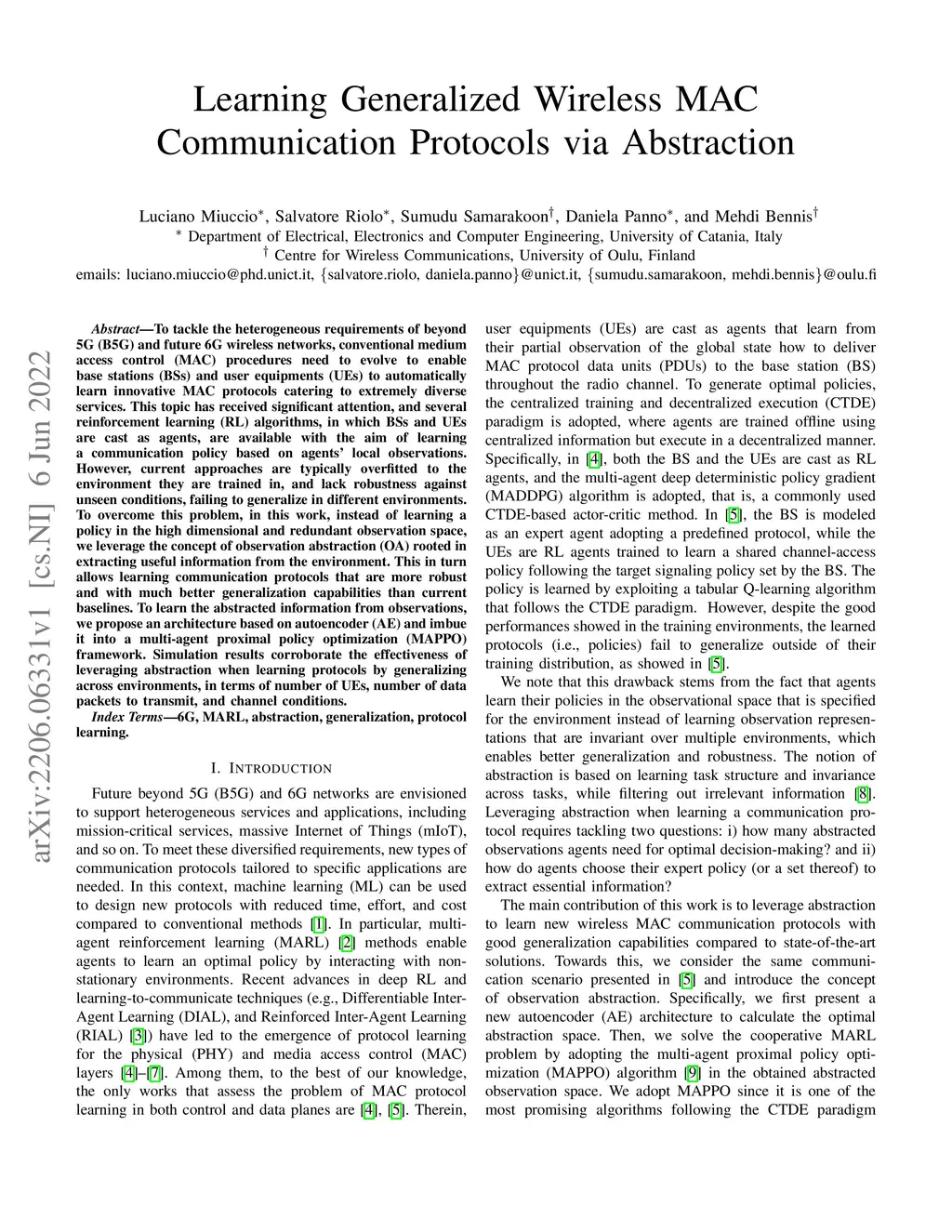 To tackle the heterogeneous requirements of beyond 5G (B5G) and future 6G wireless networks, conventional medium access control (MAC) procedures need to evolve to enable base stations (BSs) and user equipments (UEs) to automatically learn innovative MAC protocols catering to extremely diverse services. This topic has received significant attention, and several reinforcement learning (RL) algorithms, in which BSs and UEs are cast as agents, are available with the aim of learning a communication policy based on agents' local observations. However, current approaches are typically overfitted to the environment they are trained in, and lack robustness against unseen conditions, failing to generalize in different environments. To overcome this problem, in this work, instead of learning a policy in the high dimensional and redundant observation space, we leverage the concept of observation abstraction (OA) rooted in extracting useful information from the environment. This in turn allows learning communication protocols that are more robust and with much better generalization capabilities than current baselines. To learn the abstracted information from observations, we propose an architecture based on autoencoder (AE) and imbue it into a multi-agent proximal policy optimization (MAPPO) framework. Simulation results corroborate the effectiveness of leveraging abstraction when learning protocols by generalizing across environments, in terms of number of UEs, number of data packets to transmit, and channel conditions.