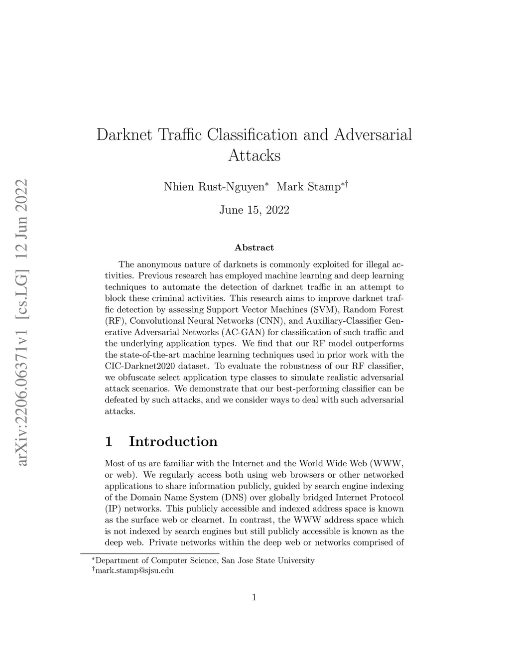 The anonymous nature of darknets is commonly exploited for illegal activities. Previous research has employed machine learning and deep learning techniques to automate the detection of darknet traffic in an attempt to block these criminal activities. This research aims to improve darknet traffic detection by assessing Support Vector Machines (SVM), Random Forest (RF), Convolutional Neural Networks (CNN), and Auxiliary-Classifier Generative Adversarial Networks (AC-GAN) for classification of such traffic and the underlying application types. We find that our RF model outperforms the state-of-the-art machine learning techniques used in prior work with the CIC-Darknet2020 dataset. To evaluate the robustness of our RF classifier, we obfuscate select application type classes to simulate realistic adversarial attack scenarios. We demonstrate that our best-performing classifier can be defeated by such attacks, and we consider ways to deal with such adversarial attacks.