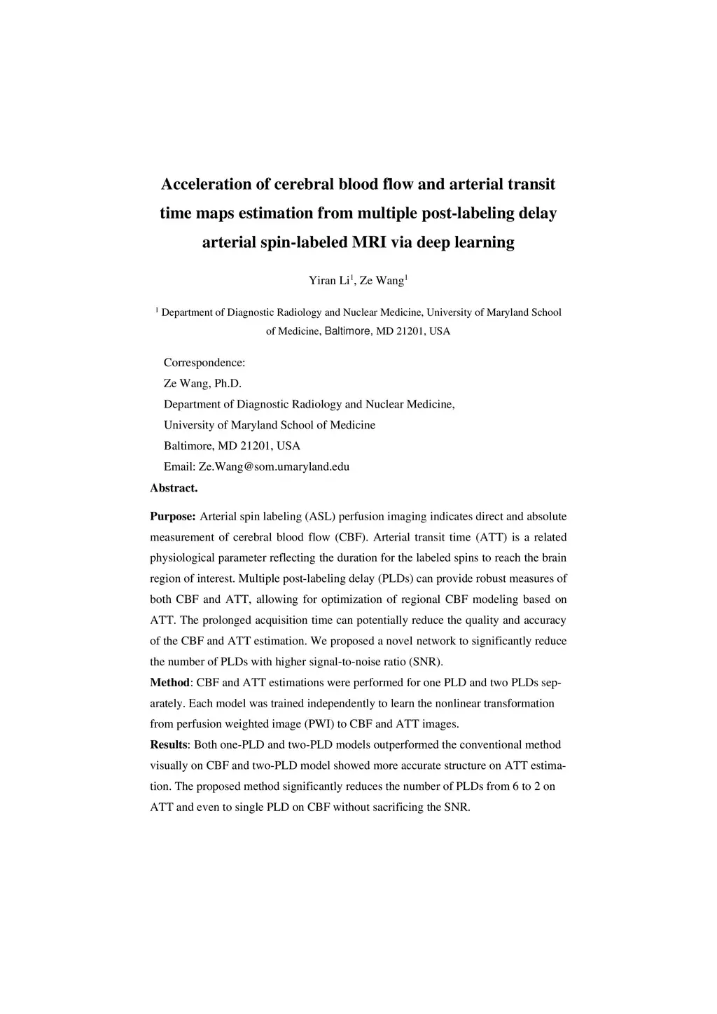 Purpose: Arterial spin labeling (ASL) perfusion imaging indicates direct and absolute measurement of cerebral blood flow (CBF). Arterial transit time (ATT) is a related physiological parameter reflecting the duration for the labeled spins to reach the brain region of interest. Multiple post-labeling delay (PLDs) can provide robust measures of both CBF and ATT, allowing for optimization of regional CBF modeling based on ATT. The prolonged acquisition time can potentially reduce the quality and accuracy of the CBF and ATT estimation. We proposed a novel network to significantly reduce the number of PLDs with higher signal-to-noise ratio (SNR). Method: CBF and ATT estimations were performed for one PLD and two PLDs sepa-rately. Each model was trained independently to learn the nonlinear transformation from perfusion weighted image (PWI) to CBF and ATT images. Results: Both one-PLD and two-PLD models outperformed the conventional method visually on CBF and two-PLD model showed more accurate structure on ATT estima-tion. The proposed method significantly reduces the number of PLDs from 6 to 2 on ATT and even to single PLD on CBF without sacrificing the SNR. Conclusion: It is feasible to generate CBF and ATT maps with reduced PLDs using deep learning with high quality.