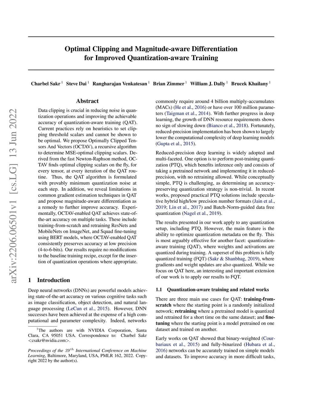 Data clipping is crucial in reducing noise in quantization operations and improving the achievable accuracy of quantization-aware training (QAT). Current practices rely on heuristics to set clipping threshold scalars and cannot be shown to be optimal. We propose Optimally Clipped Tensors And Vectors (OCTAV), a recursive algorithm to determine MSE-optimal clipping scalars. Derived from the fast Newton-Raphson method, OCTAV finds optimal clipping scalars on the fly, for every tensor, at every iteration of the QAT routine. Thus, the QAT algorithm is formulated with provably minimum quantization noise at each step. In addition, we reveal limitations in common gradient estimation techniques in QAT and propose magnitude-aware differentiation as a remedy to further improve accuracy. Experimentally, OCTAV-enabled QAT achieves state-of-the-art accuracy on multiple tasks. These include training-from-scratch and retraining ResNets and MobileNets on ImageNet, and Squad fine-tuning using BERT models, where OCTAV-enabled QAT consistently preserves accuracy at low precision (4-to-6-bits). Our results require no modifications to the baseline training recipe, except for the insertion of quantization operations where appropriate.