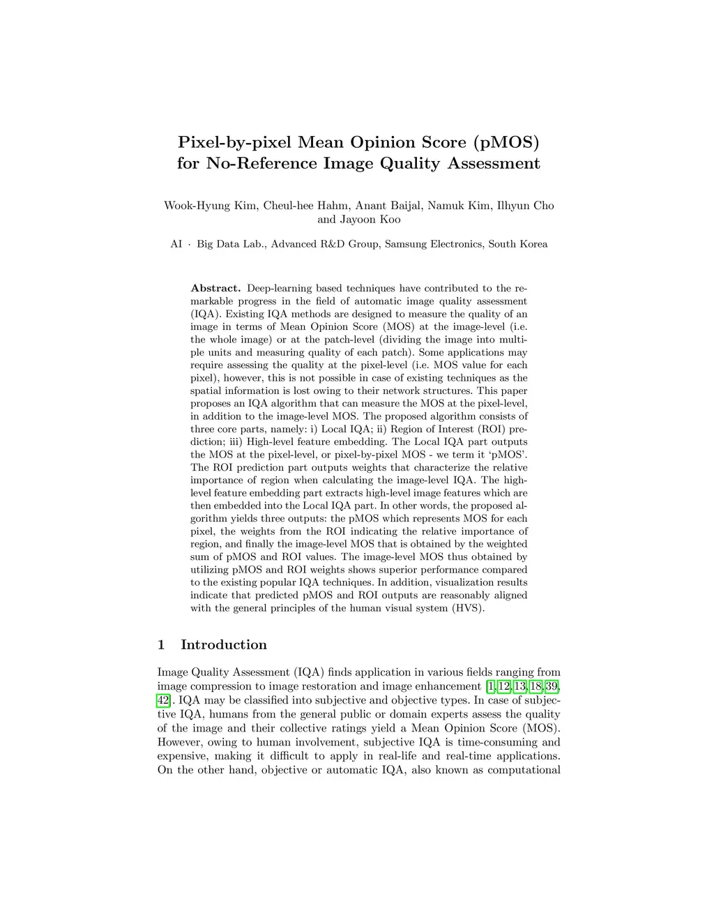 Deep-learning based techniques have contributed to the remarkable progress in the field of automatic image quality assessment (IQA). Existing IQA methods are designed to measure the quality of an image in terms of Mean Opinion Score (MOS) at the image-level (i.e. the whole image) or at the patch-level (dividing the image into multiple units and measuring quality of each patch). Some applications may require assessing the quality at the pixel-level (i.e. MOS value for each pixel), however, this is not possible in case of existing techniques as the spatial information is lost owing to their network structures. This paper proposes an IQA algorithm that can measure the MOS at the pixel-level, in addition to the image-level MOS. The proposed algorithm consists of three core parts, namely: i) Local IQA; ii) Region of Interest (ROI) prediction; iii) High-level feature embedding. The Local IQA part outputs the MOS at the pixel-level, or pixel-by-pixel MOS - we term it 'pMOS'. The ROI prediction part outputs weights that characterize the relative importance of region when calculating the image-level IQA. The high-level feature embedding part extracts high-level image features which are then embedded into the Local IQA part. In other words, the proposed algorithm yields three outputs: the pMOS which represents MOS for each pixel, the weights from the ROI indicating the relative importance of region, and finally the image-level MOS that is obtained by the weighted sum of pMOS and ROI values. The image-level MOS thus obtained by utilizing pMOS and ROI weights shows superior performance compared to the existing popular IQA techniques. In addition, visualization results indicate that predicted pMOS and ROI outputs are reasonably aligned with the general principles of the human visual system (HVS).