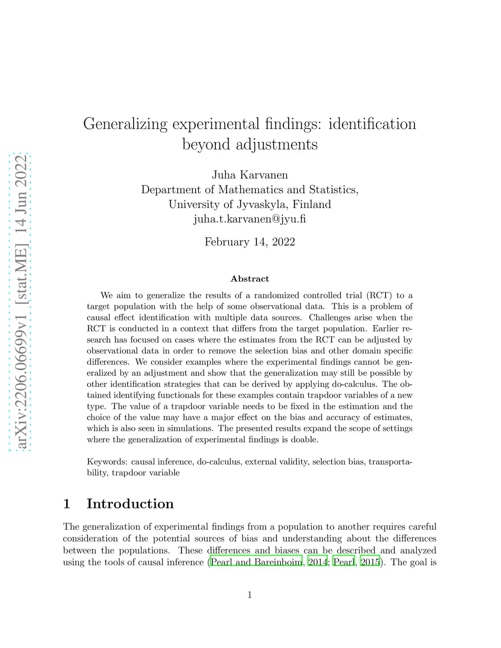 We aim to generalize the results of a randomized controlled trial (RCT) to a target population with the help of some observational data. This is a problem of causal effect identification with multiple data sources. Challenges arise when the RCT is conducted in a context that differs from the target population. Earlier research has focused on cases where the estimates from the RCT can be adjusted by observational data in order to remove the selection bias and other domain specific differences. We consider examples where the experimental findings cannot be generalized by an adjustment and show that the generalization may still be possible by other identification strategies that can be derived by applying do-calculus. The obtained identifying functionals for these examples contain trapdoor variables of a new type. The value of a trapdoor variable needs to be fixed in the estimation and the choice of the value may have a major effect on the bias and accuracy of estimates, which is also seen in simulations. The presented results expand the scope of settings where the generalization of experimental findings is doable
