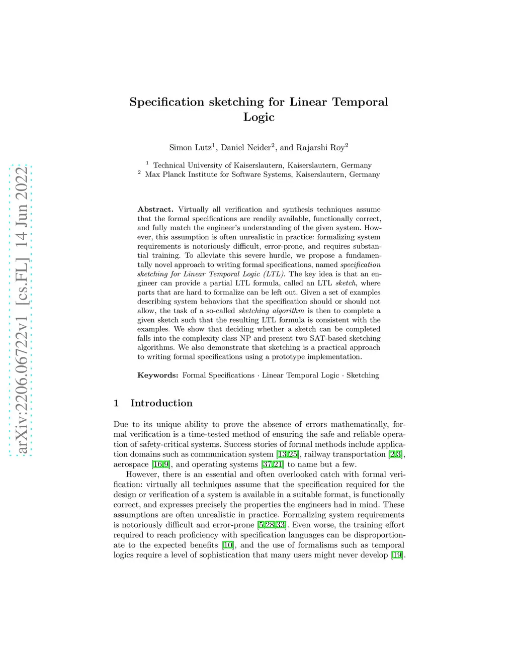 Virtually all verification and synthesis techniques assume that the formal specifications are readily available, functionally correct, and fully match the engineer's understanding of the given system. However, this assumption is often unrealistic in practice: formalizing system requirements is notoriously difficult, error-prone, and requires substantial training. To alleviate this severe hurdle, we propose a fundamentally novel approach to writing formal specifications, named specification sketching for Linear Temporal Logic (LTL). The key idea is that an engineer can provide a partial LTL formula, called an LTL sketch, where parts that are hard to formalize can be left out. Given a set of examples describing system behaviors that the specification should or should not allow, the task of a so-called sketching algorithm is then to complete a given sketch such that the resulting LTL formula is consistent with the examples. We show that deciding whether a sketch can be completed falls into the complexity class NP and present two SAT-based sketching algorithms. We also demonstrate that sketching is a practical approach to writing formal specifications using a prototype implementation.