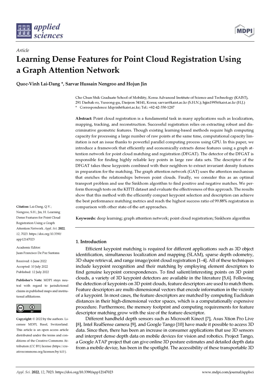 Point cloud registration is a fundamental task in many applications such as localization, mapping, tracking, and reconstruction. Successful registration relies on extracting robust and discriminative geometric features. Though existing learning based methods require high computing capacity for processing a large number of raw points at the same time, computational capacity limitation is not an issue thanks to the powerful parallel computing process using GPU. In this paper, we introduce a framework that efficiently and economically extracts dense features using a graph attention network for point cloud matching and registration (DFGAT). The detector of the DFGAT is responsible for finding highly reliable key points in large raw data sets. The descriptor of the DFGAT takes these keypoints combined with their neighbors to extract invariant density features in preparation for the matching. The graph attention network (GAT) uses the attention mechanism that enriches the relationships between point clouds. Finally, we consider this as an optimal transport problem and use the Sinkhorn algorithm to find positive and negative matches. We perform thorough tests on the KITTI dataset and evaluate the effectiveness of this approach. The results show that this method with the efficiently compact keypoint selection and description can achieve the best performance matching metrics and reach the highest success ratio of 99.88% registration in comparison with other state of the art approaches.