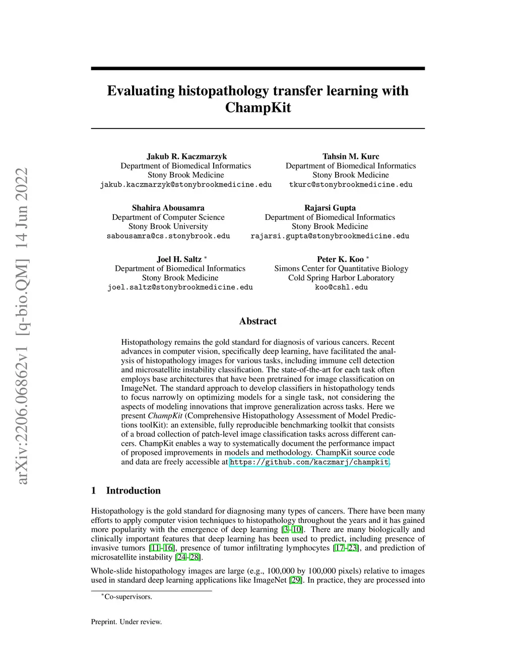 Histopathology remains the gold standard for diagnosis of various cancers. Recent advances in computer vision, specifically deep learning, have facilitated the analysis of histopathology images for various tasks, including immune cell detection and microsatellite instability classification. The state-of-the-art for each task often employs base architectures that have been pretrained for image classification on ImageNet. The standard approach to develop classifiers in histopathology tends to focus narrowly on optimizing models for a single task, not considering the aspects of modeling innovations that improve generalization across tasks. Here we present ChampKit (Comprehensive Histopathology Assessment of Model Predictions toolKit): an extensible, fully reproducible benchmarking toolkit that consists of a broad collection of patch-level image classification tasks across different cancers. ChampKit enables a way to systematically document the performance impact of proposed improvements in models and methodology. ChampKit source code and data are freely accessible at https://github.com/kaczmarj/champkit .