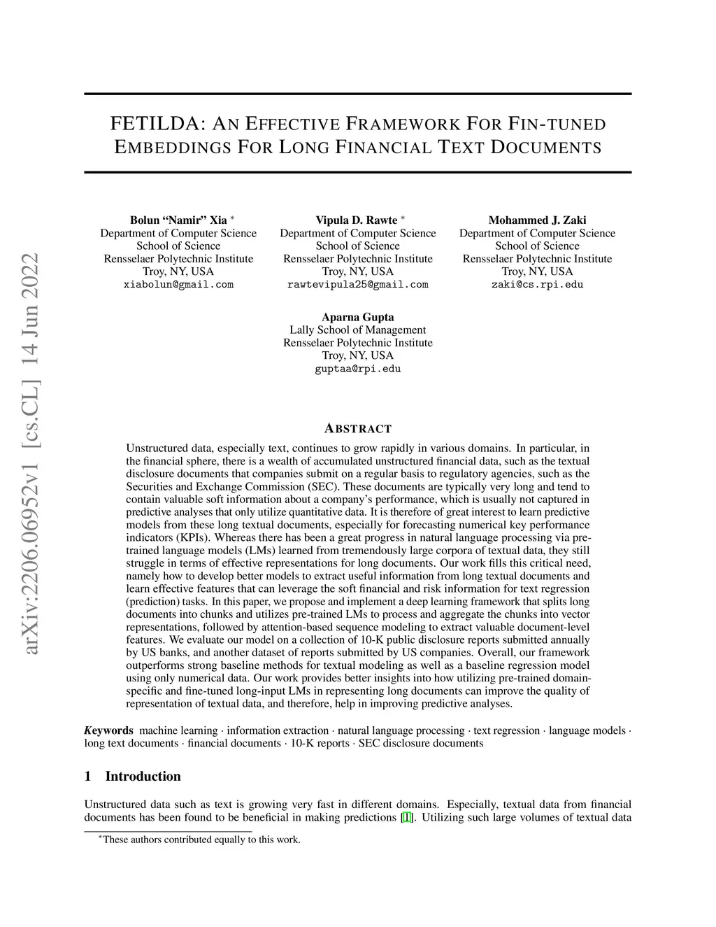 Unstructured data, especially text, continues to grow rapidly in various domains. In particular, in the financial sphere, there is a wealth of accumulated unstructured financial data, such as the textual disclosure documents that companies submit on a regular basis to regulatory agencies, such as the Securities and Exchange Commission (SEC). These documents are typically very long and tend to contain valuable soft information about a company's performance. It is therefore of great interest to learn predictive models from these long textual documents, especially for forecasting numerical key performance indicators (KPIs). Whereas there has been a great progress in pre-trained language models (LMs) that learn from tremendously large corpora of textual data, they still struggle in terms of effective representations for long documents. Our work fills this critical need, namely how to develop better models to extract useful information from long textual documents and learn effective features that can leverage the soft financial and risk information for text regression (prediction) tasks. In this paper, we propose and implement a deep learning framework that splits long documents into chunks and utilizes pre-trained LMs to process and aggregate the chunks into vector representations, followed by self-attention to extract valuable document-level features. We evaluate our model on a collection of 10-K public disclosure reports from US banks, and another dataset of reports submitted by US companies. Overall, our framework outperforms strong baseline methods for textual modeling as well as a baseline regression model using only numerical data. Our work provides better insights into how utilizing pre-trained domain-specific and fine-tuned long-input LMs in representing long documents can improve the quality of representation of textual data, and therefore, help in improving predictive analyses.