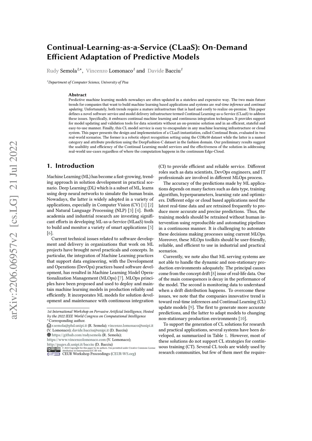 Predictive machine learning models nowadays are often updated in a stateless and expensive way. The two main future trends for companies that want to build machine learning-based applications and systems are real-time inference and continual updating. Unfortunately, both trends require a mature infrastructure that is hard and costly to realize on-premise. This paper defines a novel software service and model delivery infrastructure termed Continual Learning-as-a-Service (CLaaS) to address these issues. Specifically, it embraces continual machine learning and continuous integration techniques. It provides support for model updating and validation tools for data scientists without an on-premise solution and in an efficient, stateful and easy-to-use manner. Finally, this CL model service is easy to encapsulate in any machine learning infrastructure or cloud system. This paper presents the design and implementation of a CLaaS instantiation, called LiquidBrain, evaluated in two real-world scenarios. The former is a robotic object recognition setting using the CORe50 dataset while the latter is a named category and attribute prediction using the DeepFashion-C dataset in the fashion domain. Our preliminary results suggest the usability and efficiency of the Continual Learning model services and the effectiveness of the solution in addressing real-world use-cases regardless of where the computation happens in the continuum Edge-Cloud.