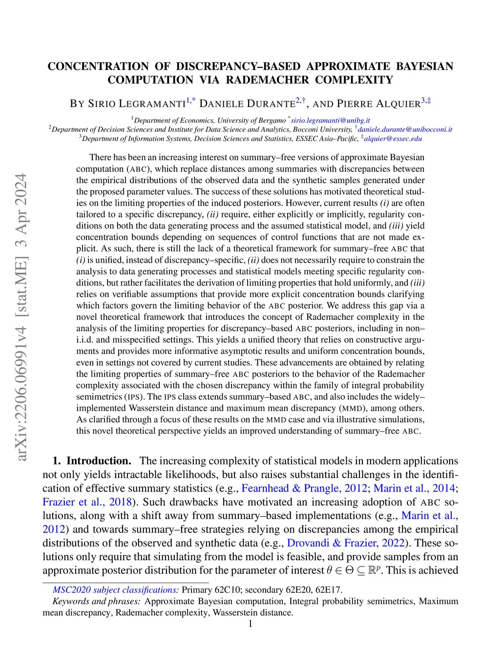 There has been an increasing interest on summary-free versions of approximate Bayesian computation (ABC), which replace distances among summaries with discrepancies between the empirical distributions of the observed data and the synthetic samples generated under the proposed parameter values. The success of these solutions has motivated theoretical studies on the limiting properties of the induced posteriors. However, current results (i) are often tailored to a specific discrepancy, (ii) require, either explicitly or implicitly, regularity conditions on the data generating process and the assumed statistical model, and (iii) yield bounds depending on sequences of control functions that are not made explicit. As such, there is the lack of a theoretical framework that (i) is unified, (ii) facilitates the derivation of limiting properties that hold uniformly, and (iii) relies on verifiable assumptions that provide concentration bounds clarifying which factors govern the limiting behavior of the ABC posterior. We address this gap via a novel theoretical framework that introduces the concept of Rademacher complexity in the analysis of the limiting properties for discrepancy-based ABC posteriors. This yields a unified theory that relies on constructive arguments and provides more informative asymptotic results and uniform concentration bounds, even in settings not covered by current studies. These advancements are obtained by relating the properties of summary-free ABC posteriors to the behavior of the Rademacher complexity associated with the chosen discrepancy within the family of integral probability semimetrics. This family extends summary-based ABC, and includes the Wasserstein distance and maximum mean discrepancy (MMD), among others. As clarified through a focus on the MMD case and via illustrative simulations, this perspective yields an improved understanding of summary-free ABC.