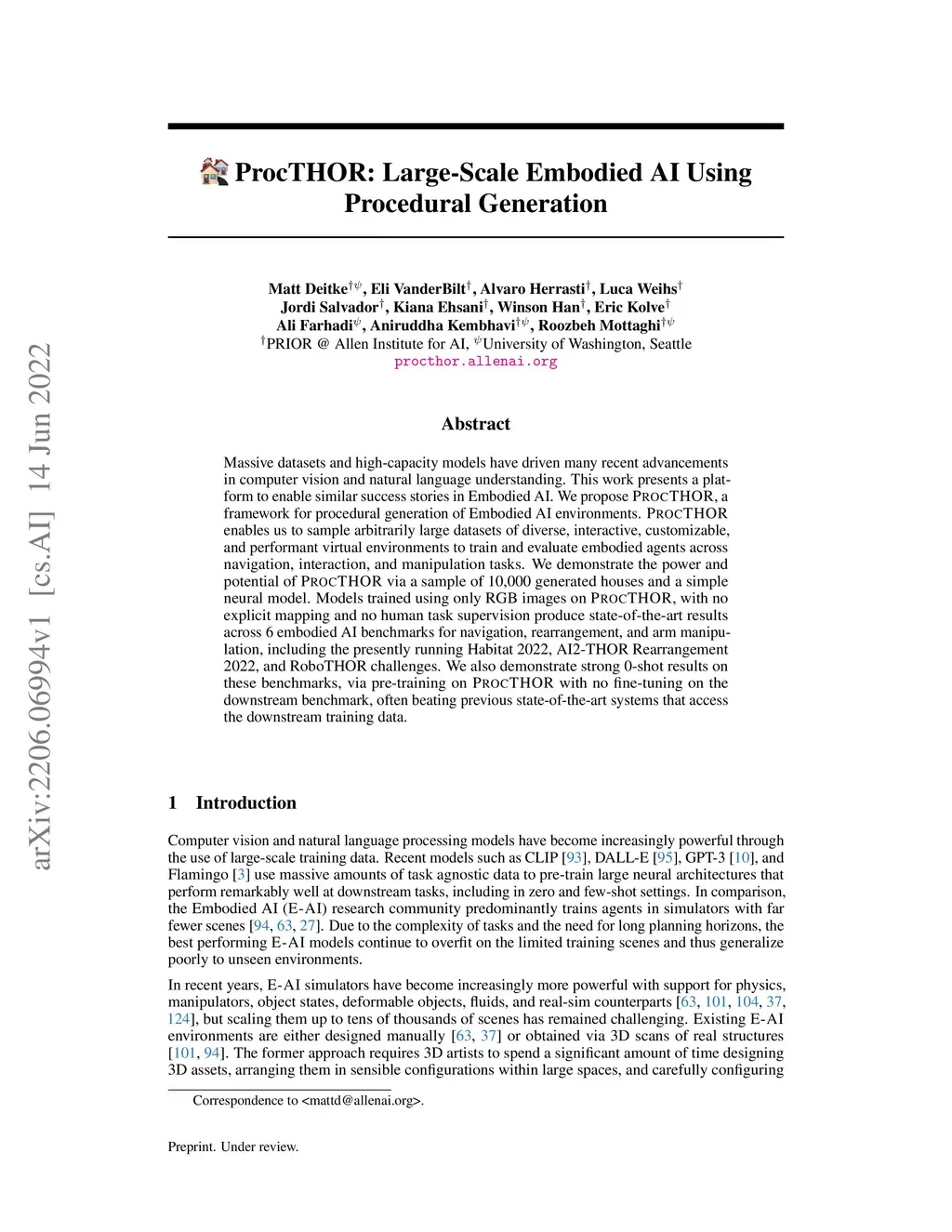 Massive datasets and high-capacity models have driven many recent advancements in computer vision and natural language understanding. This work presents a platform to enable similar success stories in Embodied AI. We propose ProcTHOR, a framework for procedural generation of Embodied AI environments. ProcTHOR enables us to sample arbitrarily large datasets of diverse, interactive, customizable, and performant virtual environments to train and evaluate embodied agents across navigation, interaction, and manipulation tasks. We demonstrate the power and potential of ProcTHOR via a sample of 10,000 generated houses and a simple neural model. Models trained using only RGB images on ProcTHOR, with no explicit mapping and no human task supervision produce state-of-the-art results across 6 embodied AI benchmarks for navigation, rearrangement, and arm manipulation, including the presently running Habitat 2022, AI2-THOR Rearrangement 2022, and RoboTHOR challenges. We also demonstrate strong 0-shot results on these benchmarks, via pre-training on ProcTHOR with no fine-tuning on the downstream benchmark, often beating previous state-of-the-art systems that access the downstream training data.