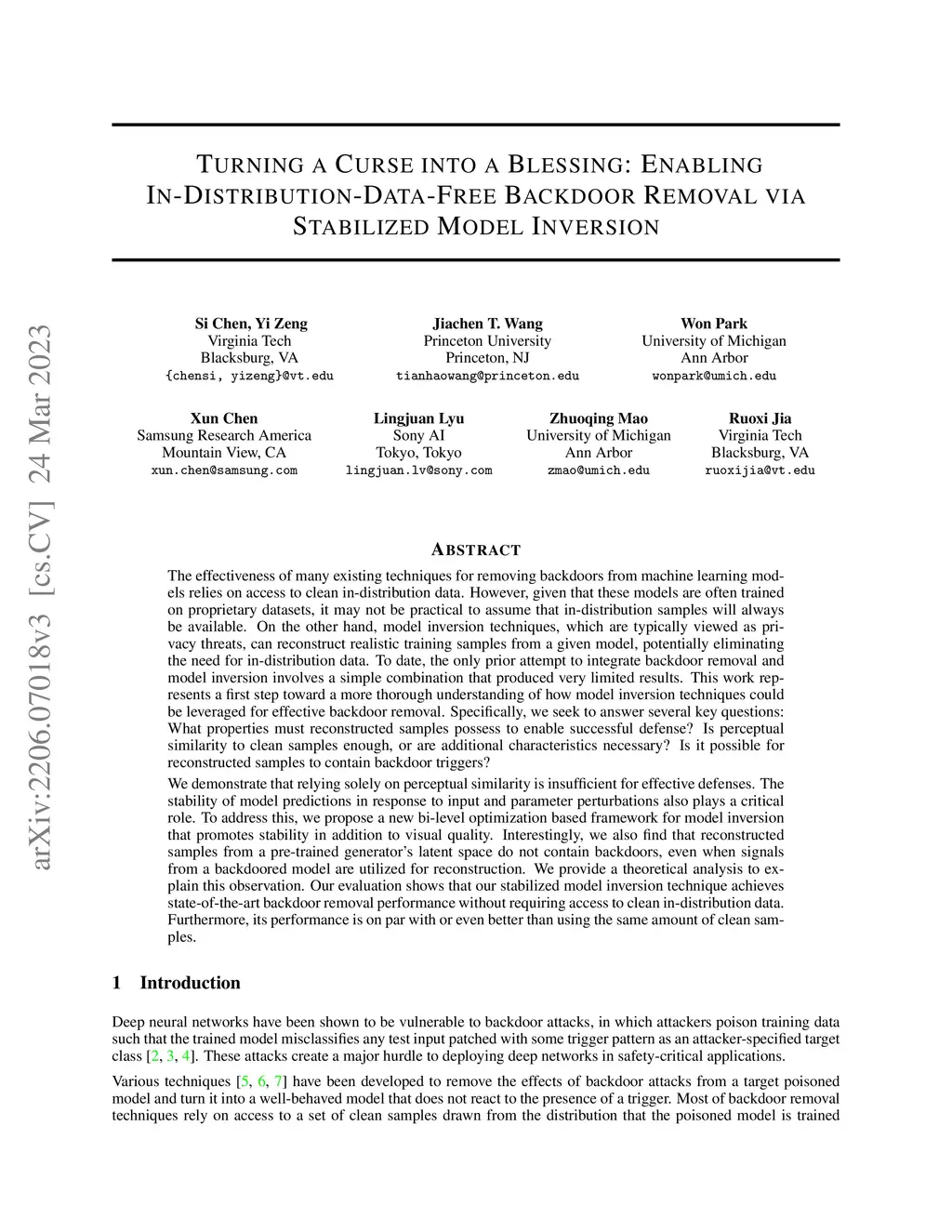 Many backdoor removal techniques in machine learning models require clean in-distribution data, which may not always be available due to proprietary datasets. Model inversion techniques, often considered privacy threats, can reconstruct realistic training samples, potentially eliminating the need for in-distribution data. Prior attempts to combine backdoor removal and model inversion yielded limited results. Our work is the first to provide a thorough understanding of leveraging model inversion for effective backdoor removal by addressing key questions about reconstructed samples' properties, perceptual similarity, and the potential presence of backdoor triggers. We establish that relying solely on perceptual similarity is insufficient for robust defenses, and the stability of model predictions in response to input and parameter perturbations is also crucial. To tackle this, we introduce a novel bi-level optimization-based framework for model inversion, promoting stability and visual quality. Interestingly, we discover that reconstructed samples from a pre-trained generator's latent space are backdoor-free, even when utilizing signals from a backdoored model. We provide a theoretical analysis to support this finding. Our evaluation demonstrates that our stabilized model inversion technique achieves state-of-the-art backdoor removal performance without clean in-distribution data, matching or surpassing performance using the same amount of clean samples.