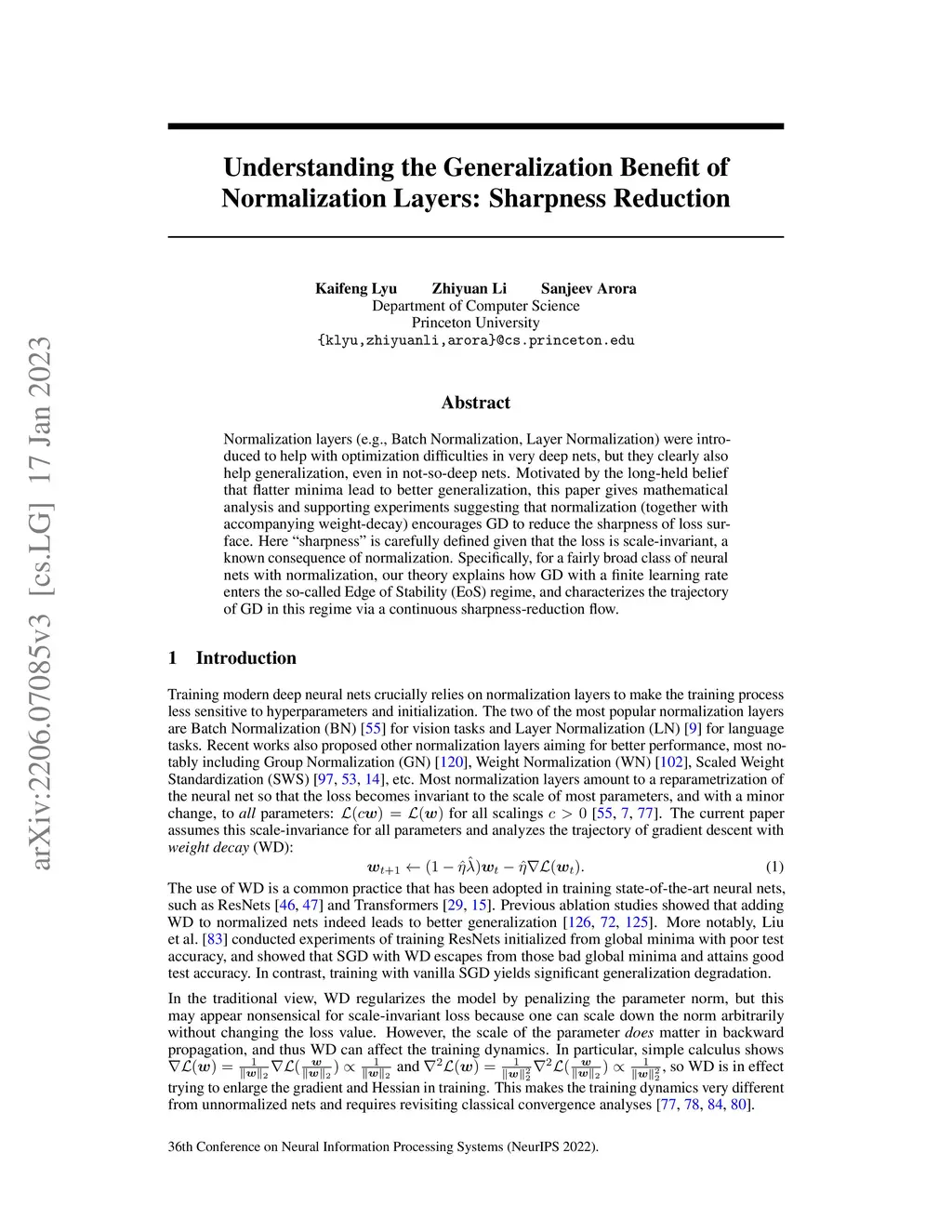 Normalization layers (e.g., Batch Normalization, Layer Normalization) were introduced to help with optimization difficulties in very deep nets, but they clearly also help generalization, even in not-so-deep nets. Motivated by the long-held belief that flatter minima lead to better generalization, this paper gives mathematical analysis and supporting experiments suggesting that normalization (together with accompanying weight-decay) encourages GD to reduce the sharpness of loss surface. Here "sharpness" is carefully defined given that the loss is scale-invariant, a known consequence of normalization. Specifically, for a fairly broad class of neural nets with normalization, our theory explains how GD with a finite learning rate enters the so-called Edge of Stability (EoS) regime, and characterizes the trajectory of GD in this regime via a continuous sharpness-reduction flow.