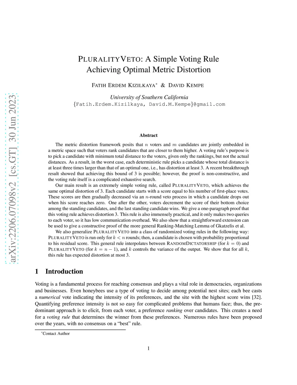 The metric distortion framework posits that n voters and m candidates are jointly embedded in a metric space such that voters rank candidates that are closer to them higher. A voting rule's purpose is to pick a candidate with minimum total distance to the voters, given only the rankings, but not the actual distances. As a result, in the worst case, each deterministic rule picks a candidate whose total distance is at least three times larger than that of an optimal one, i.e., has distortion at least 3. A recent breakthrough result showed that achieving this bound of 3 is possible; however, the proof is non-constructive, and the voting rule itself is a complicated exhaustive search. Our main result is an extremely simple voting rule, called Plurality Veto, which achieves the same optimal distortion of 3. Each candidate starts with a score equal to his number of first-place votes. These scores are then gradually decreased via an n-round veto process in which a candidate drops out when his score reaches zero. One after the other, voters decrement the score of their bottom choice among the standing candidates, and the last standing candidate wins. We give a one-paragraph proof that this voting rule achieves distortion 3. This rule is also immensely practical, and it only makes two queries to each voter, so it has low communication overhead. We also generalize Plurality Veto into a class of randomized voting rules in the following way: Plurality veto is run only for k < n rounds; then, a candidate is chosen with probability proportional to his residual score. This general rule interpolates between Random Dictatorship (for k=0) and Plurality Veto (for k=n-1), and k controls the variance of the output. We show that for all k, this rule has distortion at most 3.