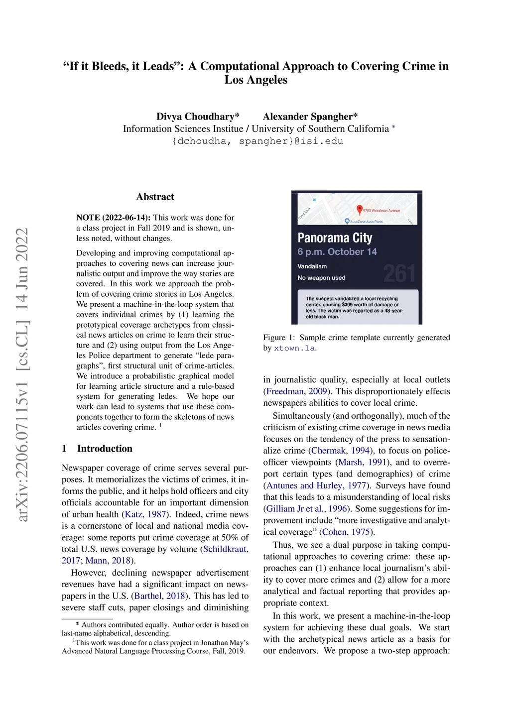 Developing and improving computational approaches to covering news can increase journalistic output and improve the way stories are covered. In this work we approach the problem of covering crime stories in Los Angeles. We present a machine-in-the-loop system that covers individual crimes by (1) learning the prototypical coverage archetypes from classical news articles on crime to learn their structure and (2) using output from the Los Angeles Police department to generate "lede paragraphs", first structural unit of crime-articles. We introduce a probabilistic graphical model for learning article structure and a rule-based system for generating ledes. We hope our work can lead to systems that use these components together to form the skeletons of news articles covering crime. This work was done for a class project in Jonathan May's Advanced Natural Language Processing Course, Fall, 2019.