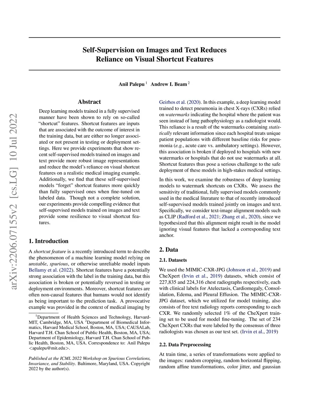 Deep learning models trained in a fully supervised manner have been shown to rely on so-called "shortcut" features. Shortcut features are inputs that are associated with the outcome of interest in the training data, but are either no longer associated or not present in testing or deployment settings. Here we provide experiments that show recent self-supervised models trained on images and text provide more robust image representations and reduce the model's reliance on visual shortcut features on a realistic medical imaging example. Additionally, we find that these self-supervised models "forget" shortcut features more quickly than fully supervised ones when fine-tuned on labeled data. Though not a complete solution, our experiments provide compelling evidence that self-supervised models trained on images and text provide some resilience to visual shortcut features.
