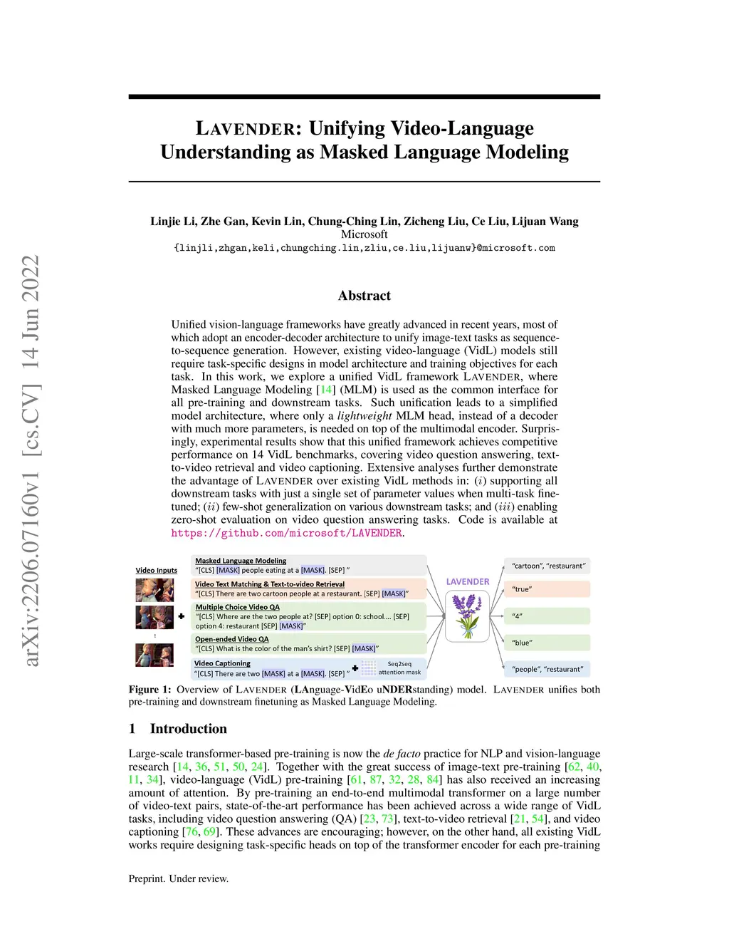 LAVENDER: Unifying Video-Language Understanding as Masked Language