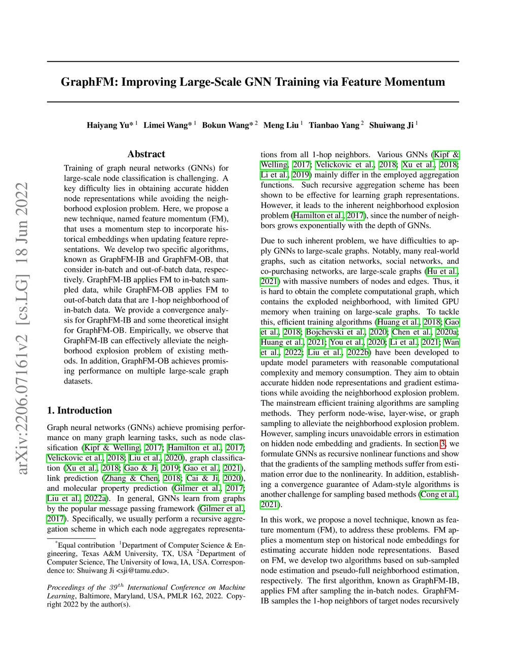 Training of graph neural networks (GNNs) for large-scale node classification is challenging. A key difficulty lies in obtaining accurate hidden node representations while avoiding the neighborhood explosion problem. Here, we propose a new technique, named feature momentum (FM), that uses a momentum step to incorporate historical embeddings when updating feature representations. We develop two specific algorithms, known as GraphFM-IB and GraphFM-OB, that consider in-batch and out-of-batch data, respectively. GraphFM-IB applies FM to in-batch sampled data, while GraphFM-OB applies FM to out-of-batch data that are 1-hop neighborhood of in-batch data. We provide a convergence analysis for GraphFM-IB and some theoretical insight for GraphFM-OB. Empirically, we observe that GraphFM-IB can effectively alleviate the neighborhood explosion problem of existing methods. In addition, GraphFM-OB achieves promising performance on multiple large-scale graph datasets.