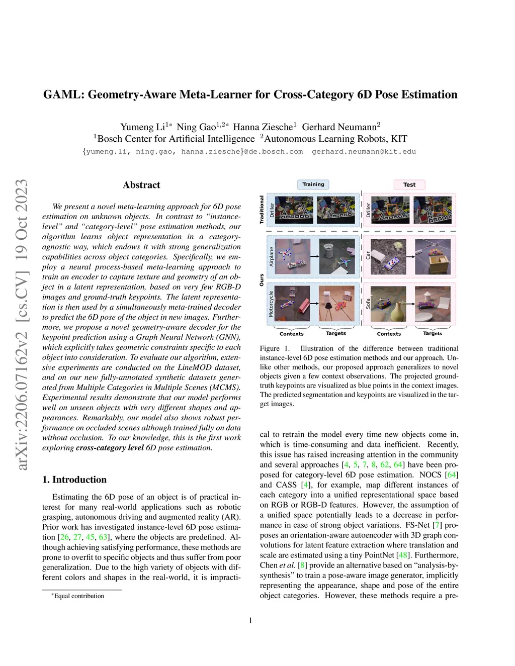 We present a novel meta-learning approach for 6D pose estimation on unknown objects. In contrast to ``instance-level" and ``category-level" pose estimation methods, our algorithm learns object representation in a category-agnostic way, which endows it with strong generalization capabilities across object categories. Specifically, we employ a neural process-based meta-learning approach to train an encoder to capture texture and geometry of an object in a latent representation, based on very few RGB-D images and ground-truth keypoints. The latent representation is then used by a simultaneously meta-trained decoder to predict the 6D pose of the object in new images. Furthermore, we propose a novel geometry-aware decoder for the keypoint prediction using a Graph Neural Network (GNN), which explicitly takes geometric constraints specific to each object into consideration. To evaluate our algorithm, extensive experiments are conducted on the \linemod dataset, and on our new fully-annotated synthetic datasets generated from Multiple Categories in Multiple Scenes (MCMS). Experimental results demonstrate that our model performs well on unseen objects with very different shapes and appearances. Remarkably, our model also shows robust performance on occluded scenes although trained fully on data without occlusion. To our knowledge, this is the first work exploring \textbf{cross-category level} 6D pose estimation.