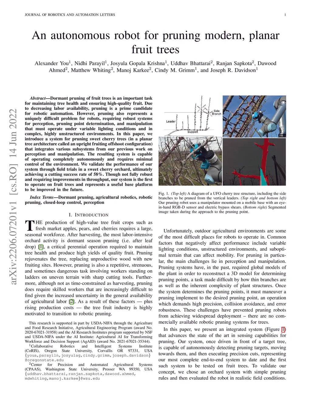 Dormant pruning of fruit trees is an important task for maintaining tree health and ensuring high-quality fruit. Due to decreasing labor availability, pruning is a prime candidate for robotic automation. However, pruning also represents a uniquely difficult problem for robots, requiring robust systems for perception, pruning point determination, and manipulation that must operate under variable lighting conditions and in complex, highly unstructured environments. In this paper, we introduce a system for pruning sweet cherry trees (in a planar tree architecture called an upright fruiting offshoot configuration) that integrates various subsystems from our previous work on perception and manipulation. The resulting system is capable of operating completely autonomously and requires minimal control of the environment. We validate the performance of our system through field trials in a sweet cherry orchard, ultimately achieving a cutting success rate of 58%. Though not fully robust and requiring improvements in throughput, our system is the first to operate on fruit trees and represents a useful base platform to be improved in the future.