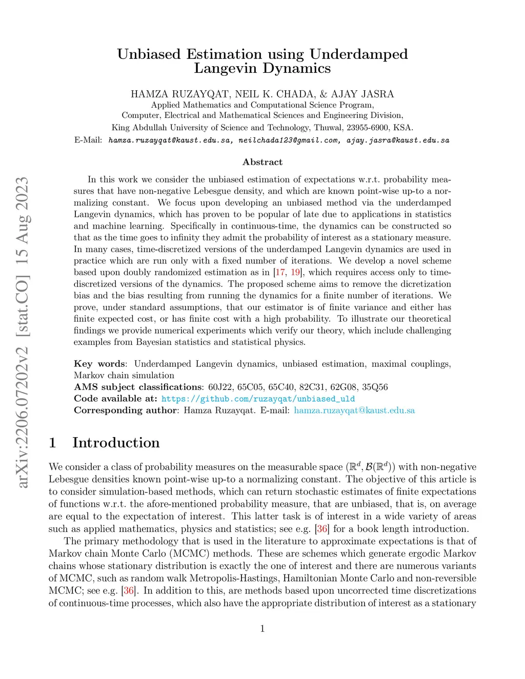 In this work we consider the unbiased estimation of expectations w.r.t.~probability measures that have non-negative Lebesgue density, and which are known point-wise up-to a normalizing constant. We focus upon developing an unbiased method via the underdamped Langevin dynamics, which has proven to be popular of late due to applications in statistics and machine learning. Specifically in continuous-time, the dynamics can be constructed {so that as the time goes to infinity they} admit the probability of interest as a stationary measure. {In many cases, time-discretized versions of the underdamped Langevin dynamics are used in practice which are run only with a fixed number of iterations.} We develop a novel scheme based upon doubly randomized estimation as in \cite{ub_grad,disc_model}, which requires access only to time-discretized versions of the dynamics. {The proposed scheme aims to remove the dicretization bias and the bias resulting from running the dynamics for a finite number of iterations}. We prove, under standard assumptions, that our estimator is of finite variance and either has finite expected cost, or has finite cost with a high probability. To illustrate our theoretical findings we provide numerical experiments which verify our theory, which include challenging examples from Bayesian statistics and statistical physics.