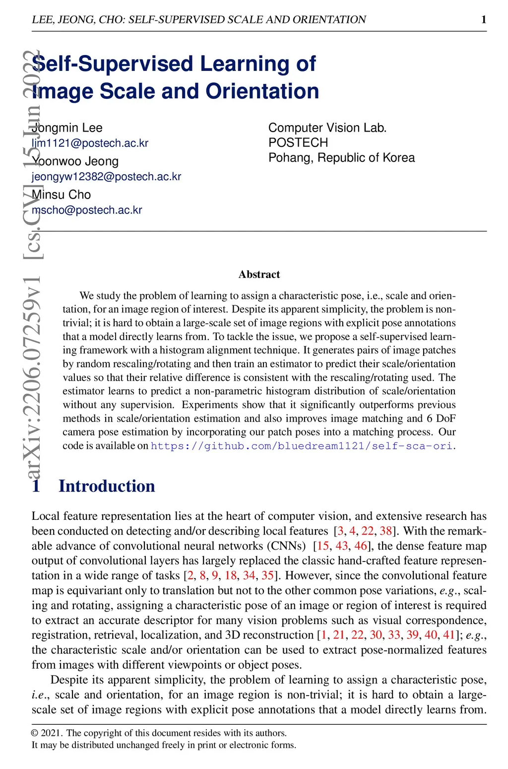 We study the problem of learning to assign a characteristic pose, i.e., scale and orientation, for an image region of interest. Despite its apparent simplicity, the problem is non-trivial; it is hard to obtain a large-scale set of image regions with explicit pose annotations that a model directly learns from. To tackle the issue, we propose a self-supervised learning framework with a histogram alignment technique. It generates pairs of image patches by random rescaling/rotating and then train an estimator to predict their scale/orientation values so that their relative difference is consistent with the rescaling/rotating used. The estimator learns to predict a non-parametric histogram distribution of scale/orientation without any supervision. Experiments show that it significantly outperforms previous methods in scale/orientation estimation and also improves image matching and 6 DoF camera pose estimation by incorporating our patch poses into a matching process.
