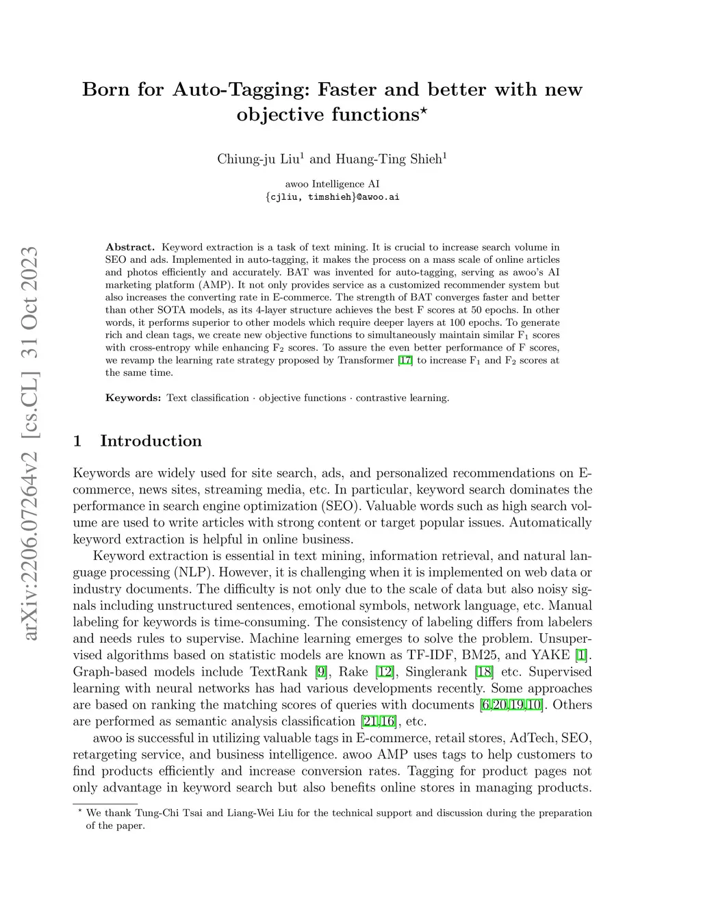 Keyword extraction is a task of text mining. It is applied to increase search volume in SEO and ads. Implemented in auto-tagging, it makes tagging on a mass scale of online articles and photos efficiently and accurately. BAT is invented for auto-tagging which served as awoo's AI marketing platform (AMP). awoo AMP not only provides service as a customized recommender system but also increases the converting rate in E-commerce. The strength of BAT converges faster and better than other SOTA models, as its 4-layer structure achieves the best F scores at 50 epochs. In other words, it performs better than other models which require deeper layers at 100 epochs. To generate rich and clean tags, awoo creates new objective functions to maintain similar scores with cross-entropy while enhancing scores simultaneously. To assure the even better performance of F scores awoo revamps the learning rate strategy proposed by Transformer \cite{Transformer} to increase and scores at the same time.