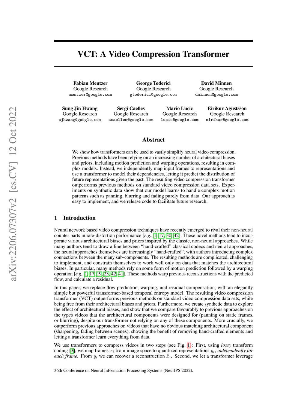 We show how transformers can be used to vastly simplify neural video compression. Previous methods have been relying on an increasing number of architectural biases and priors, including motion prediction and warping operations, resulting in complex models. Instead, we independently map input frames to representations and use a transformer to model their dependencies, letting it predict the distribution of future representations given the past. The resulting video compression transformer outperforms previous methods on standard video compression data sets. Experiments on synthetic data show that our model learns to handle complex motion patterns such as panning, blurring and fading purely from data. Our approach is easy to implement, and we release code to facilitate future research.