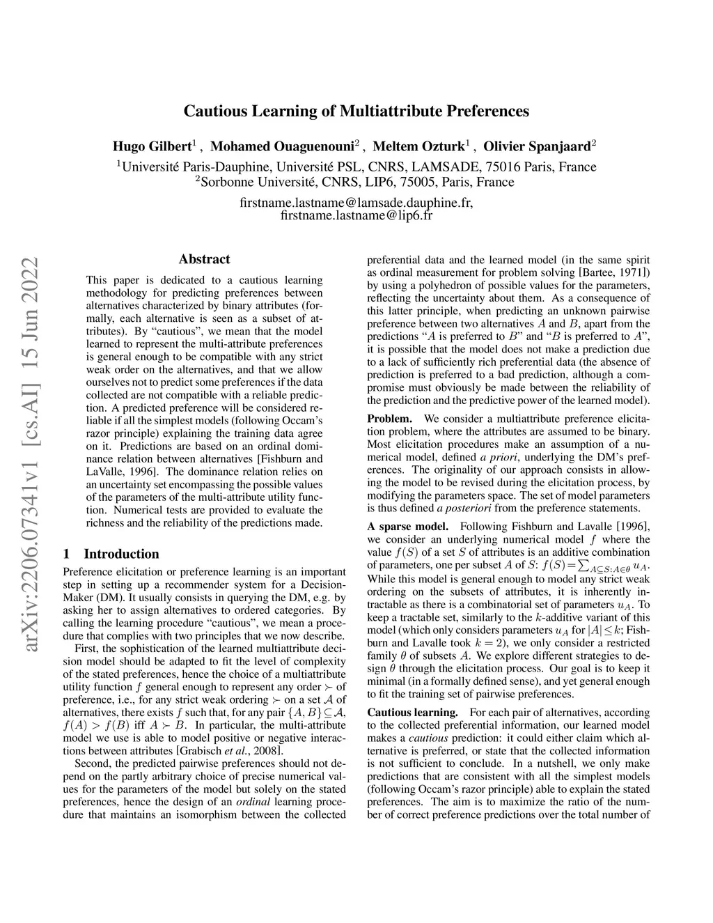 This paper is dedicated to a cautious learning methodology for predicting preferences between alternatives characterized by binary attributes (formally, each alternative is seen as a subset of attributes). By "cautious", we mean that the model learned to represent the multi-attribute preferences is general enough to be compatible with any strict weak order on the alternatives, and that we allow ourselves not to predict some preferences if the data collected are not compatible with a reliable prediction. A predicted preference will be considered reliable if all the simplest models (following Occam's razor principle) explaining the training data agree on it. Predictions are based on an ordinal dominance relation between alternatives [Fishburn and LaValle, 1996]. The dominance relation relies on an uncertainty set encompassing the possible values of the parameters of the multi-attribute utility function. Numerical tests are provided to evaluate the richness and the reliability of the predictions made.
