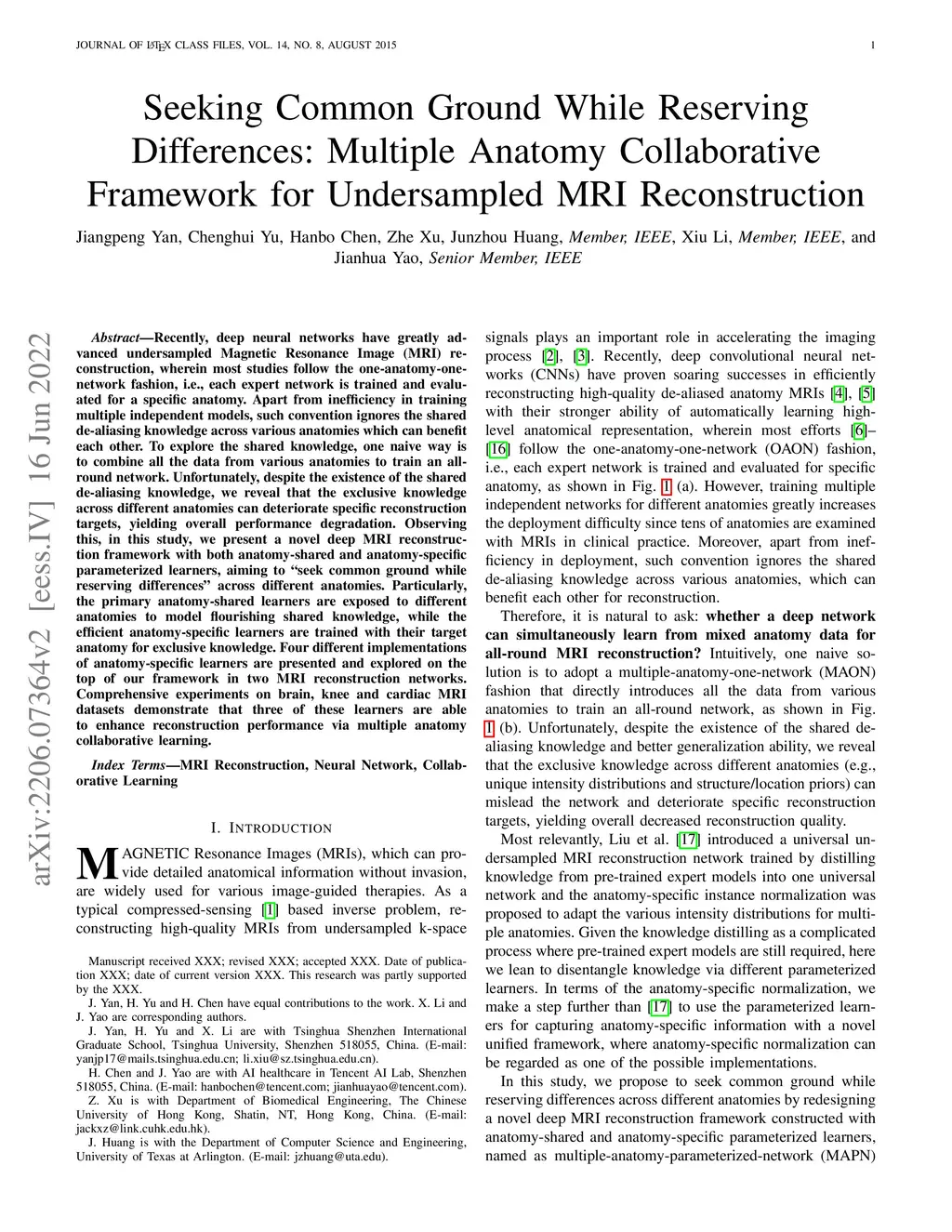 Recently, deep neural networks have greatly advanced undersampled Magnetic Resonance Image (MRI) reconstruction, wherein most studies follow the one-anatomy-one-network fashion, i.e., each expert network is trained and evaluated for a specific anatomy. Apart from inefficiency in training multiple independent models, such convention ignores the shared de-aliasing knowledge across various anatomies which can benefit each other. To explore the shared knowledge, one naive way is to combine all the data from various anatomies to train an all-round network. Unfortunately, despite the existence of the shared de-aliasing knowledge, we reveal that the exclusive knowledge across different anatomies can deteriorate specific reconstruction targets, yielding overall performance degradation. Observing this, in this study, we present a novel deep MRI reconstruction framework with both anatomy-shared and anatomy-specific parameterized learners, aiming to "seek common ground while reserving differences" across different anatomies.Particularly, the primary anatomy-shared learners are exposed to different anatomies to model flourishing shared knowledge, while the efficient anatomy-specific learners are trained with their target anatomy for exclusive knowledge. Four different implementations of anatomy-specific learners are presented and explored on the top of our framework in two MRI reconstruction networks. Comprehensive experiments on brain, knee and cardiac MRI datasets demonstrate that three of these learners are able to enhance reconstruction performance via multiple anatomy collaborative learning.