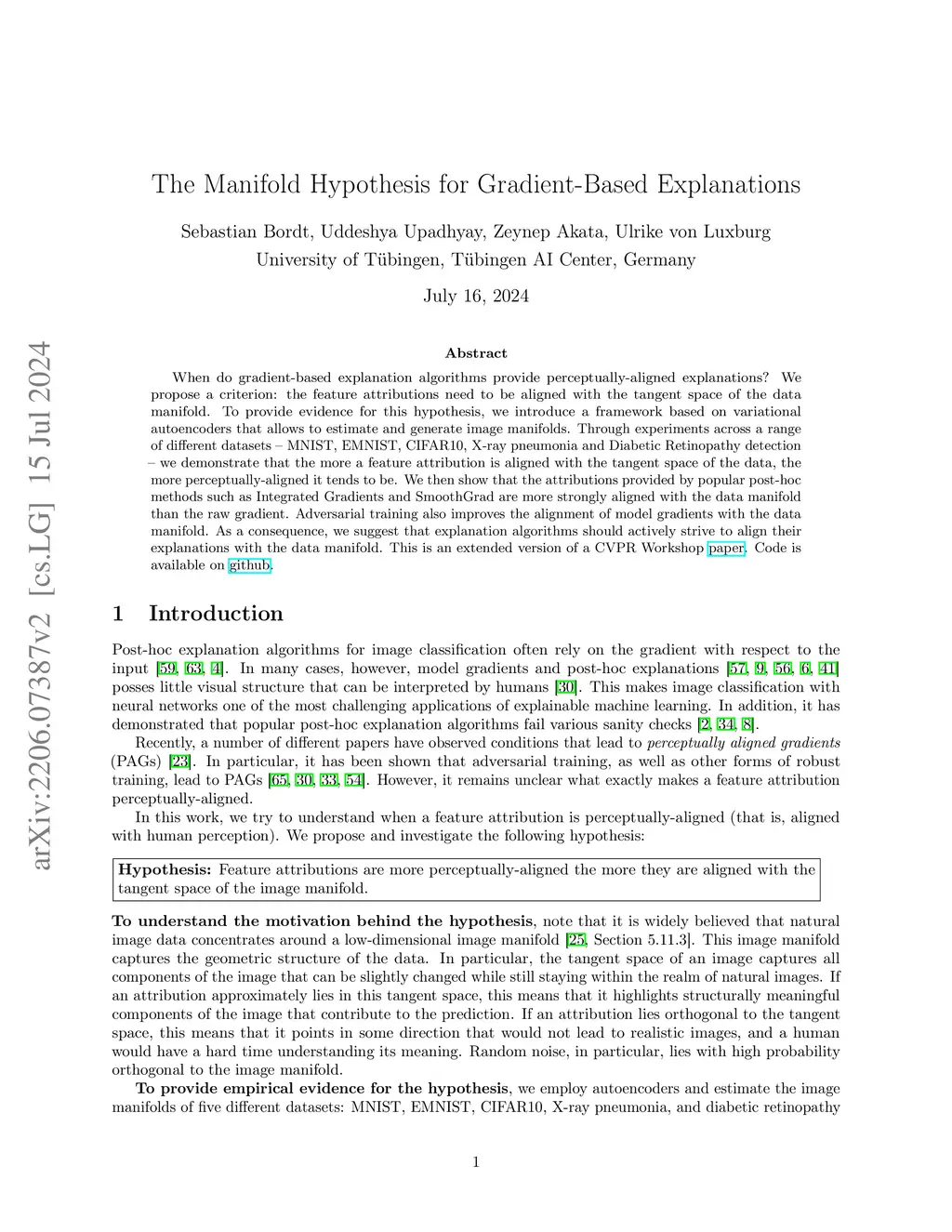 When do gradient-based explanation algorithms provide perceptually-aligned explanations? We propose a criterion: the feature attributions need to be aligned with the tangent space of the data manifold. To provide evidence for this hypothesis, we introduce a framework based on variational autoencoders that allows to estimate and generate image manifolds. Through experiments across a range of different datasets -- MNIST, EMNIST, CIFAR10, X-ray pneumonia and Diabetic Retinopathy detection -- we demonstrate that the more a feature attribution is aligned with the tangent space of the data, the more perceptually-aligned it tends to be. We then show that the attributions provided by popular post-hoc methods such as Integrated Gradients and SmoothGrad are more strongly aligned with the data manifold than the raw gradient. Adversarial training also improves the alignment of model gradients with the data manifold. As a consequence, we suggest that explanation algorithms should actively strive to align their explanations with the data manifold. This is an extended version of a CVPR Workshop paper. Code is available at https://github.com/tml-tuebingen/explanations-manifold.