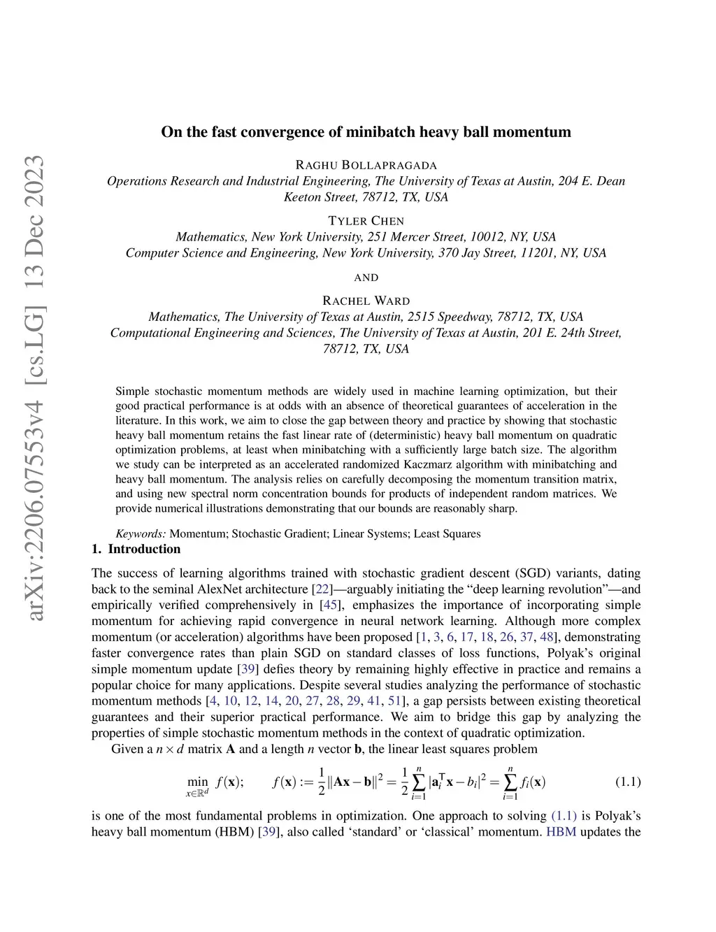 Simple stochastic momentum methods are widely used in machine learning optimization, but their good practical performance is at odds with an absence of theoretical guarantees of acceleration in the literature. In this work, we aim to close the gap between theory and practice by showing that stochastic heavy ball momentum, which can be interpreted as a randomized Kaczmarz algorithm with momentum, retains the fast linear rate of (deterministic) heavy ball momentum on quadratic optimization problems, at least when minibatching with a sufficiently large batch size is used. The analysis relies on carefully decomposing the momentum transition matrix, and using new spectral norm concentration bounds for products of independent random matrices. We provide numerical experiments to demonstrate that our bounds are reasonably sharp.