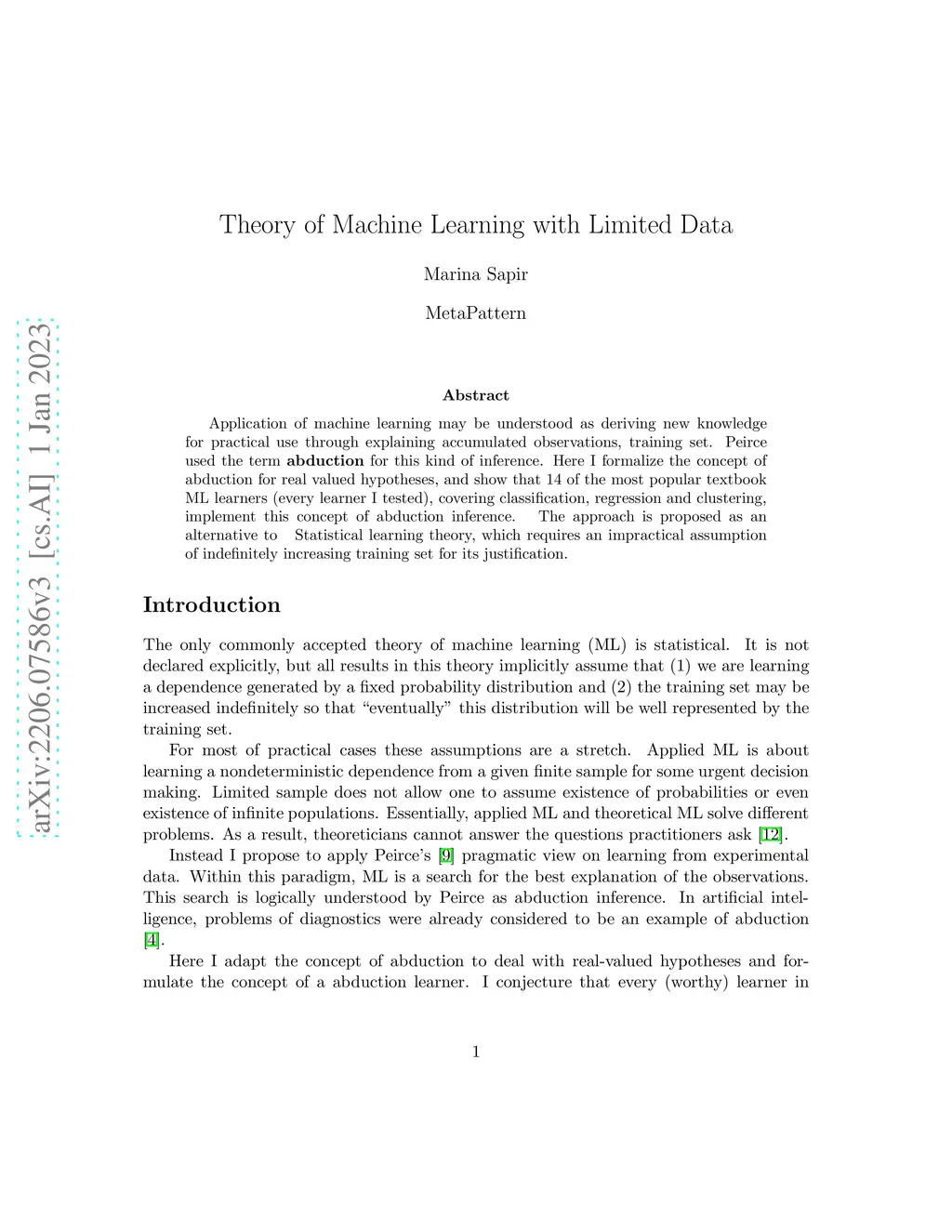 Application of machine learning may be understood as deriving new knowledge for practical use through explaining accumulated observations, training set. Peirce used the term abduction for this kind of inference. Here I formalize the concept of abduction for real valued hypotheses, and show that 14 of the most popular textbook ML learners (every learner I tested), covering classification, regression and clustering, implement this concept of abduction inference. The approach is proposed as an alternative to statistical learning theory, which requires an impractical assumption of indefinitely increasing training set for its justification.