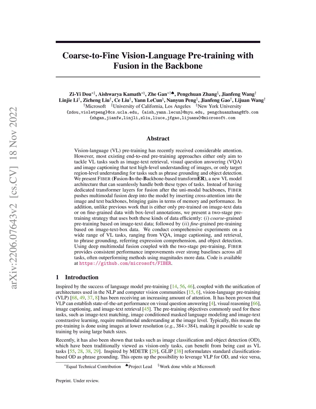 Vision-language (VL) pre-training has recently received considerable attention. However, most existing end-to-end pre-training approaches either only aim to tackle VL tasks such as image-text retrieval, visual question answering (VQA) and image captioning that test high-level understanding of images, or only target region-level understanding for tasks such as phrase grounding and object detection. We present FIBER (Fusion-In-the-Backbone-based transformER), a new VL model architecture that can seamlessly handle both these types of tasks. Instead of having dedicated transformer layers for fusion after the uni-modal backbones, FIBER pushes multimodal fusion deep into the model by inserting cross-attention into the image and text backbones, bringing gains in terms of memory and performance. In addition, unlike previous work that is either only pre-trained on image-text data or on fine-grained data with box-level annotations, we present a two-stage pre-training strategy that uses both these kinds of data efficiently: (i) coarse-grained pre-training based on image-text data; followed by (ii) fine-grained pre-training based on image-text-box data. We conduct comprehensive experiments on a wide range of VL tasks, ranging from VQA, image captioning, and retrieval, to phrase grounding, referring expression comprehension, and object detection. Using deep multimodal fusion coupled with the two-stage pre-training, FIBER provides consistent performance improvements over strong baselines across all tasks, often outperforming methods using magnitudes more data. Code is available at https://github.com/microsoft/FIBER.