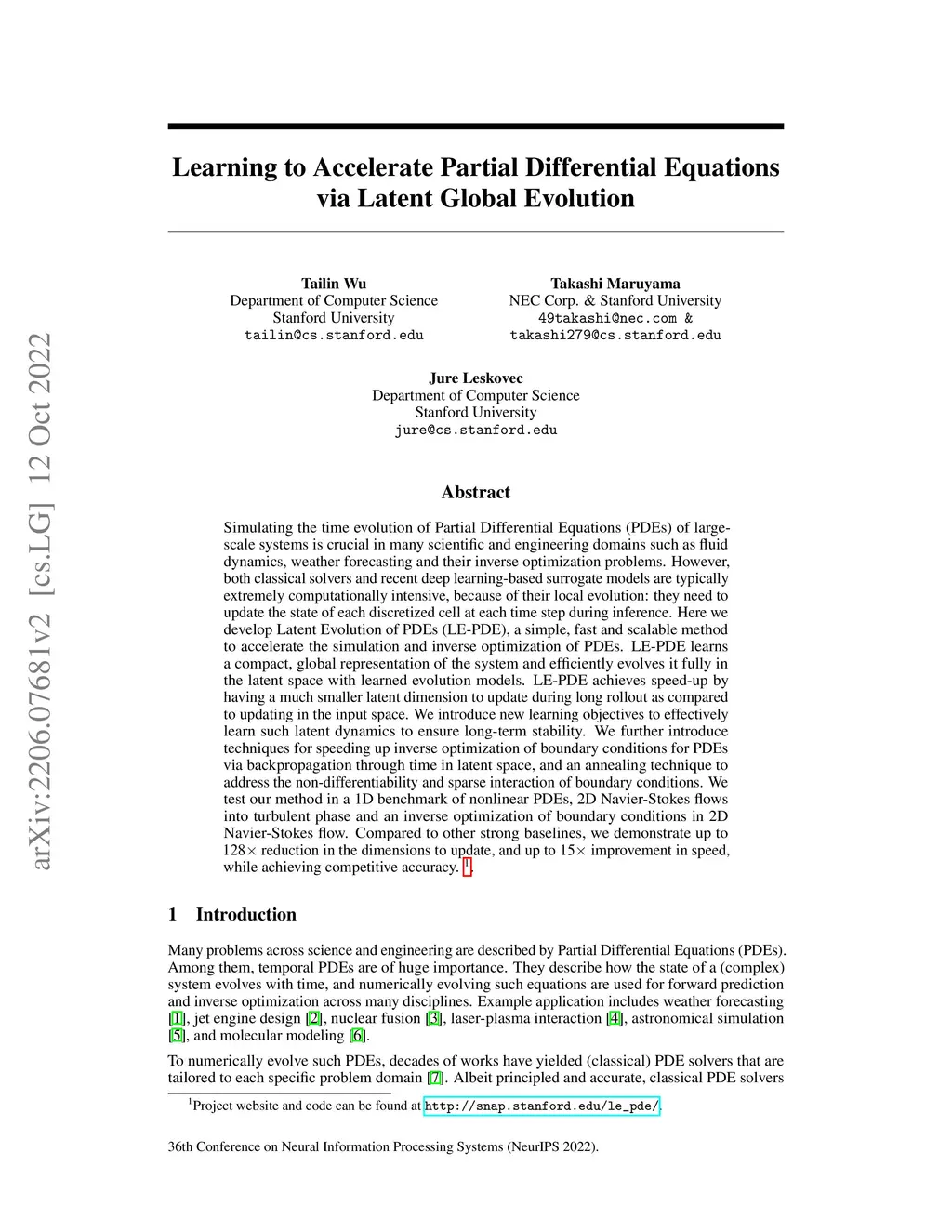 Simulating the time evolution of Partial Differential Equations (PDEs) of large-scale systems is crucial in many scientific and engineering domains such as fluid dynamics, weather forecasting and their inverse optimization problems. However, both classical solvers and recent deep learning-based surrogate models are typically extremely computationally intensive, because of their local evolution: they need to update the state of each discretized cell at each time step during inference. Here we develop Latent Evolution of PDEs (LE-PDE), a simple, fast and scalable method to accelerate the simulation and inverse optimization of PDEs. LE-PDE learns a compact, global representation of the system and efficiently evolves it fully in the latent space with learned latent evolution models. LE-PDE achieves speed-up by having a much smaller latent dimension to update during long rollout as compared to updating in the input space. We introduce new learning objectives to effectively learn such latent dynamics to ensure long-term stability. We further introduce techniques for speeding-up inverse optimization of boundary conditions for PDEs via backpropagation through time in latent space, and an annealing technique to address the non-differentiability and sparse interaction of boundary conditions. We test our method in a 1D benchmark of nonlinear PDEs, 2D Navier-Stokes flows into turbulent phase and an inverse optimization of boundary conditions in 2D Navier-Stokes flow. Compared to state-of-the-art deep learning-based surrogate models and other strong baselines, we demonstrate up to 128x reduction in the dimensions to update, and up to 15x improvement in speed, while achieving competitive accuracy.