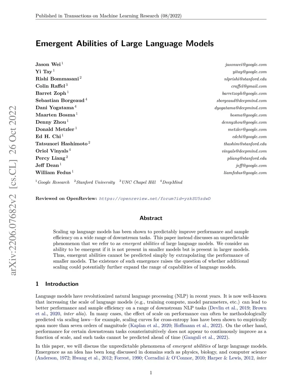 Scaling up language models has been shown to predictably improve performance and sample efficiency on a wide range of downstream tasks. This paper instead discusses an unpredictable phenomenon that we refer to as emergent abilities of large language models. We consider an ability to be emergent if it is not present in smaller models but is present in larger models. Thus, emergent abilities cannot be predicted simply by extrapolating the performance of smaller models. The existence of such emergence implies that additional scaling could further expand the range of capabilities of language models.