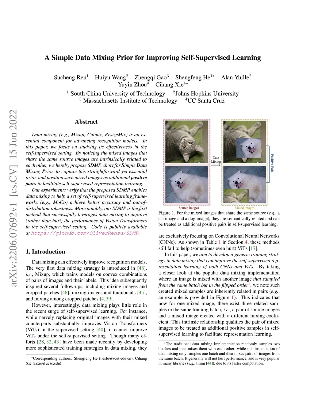 Data mixing (e.g., Mixup, Cutmix, ResizeMix) is an essential component for advancing recognition models. In this paper, we focus on studying its effectiveness in the self-supervised setting. By noticing the mixed images that share the same source images are intrinsically related to each other, we hereby propose SDMP, short for imple ata ixing rior, to capture this straightforward yet essential prior, and position such mixed images as additional to facilitate self-supervised representation learning. Our experiments verify that the proposed SDMP enables data mixing to help a set of self-supervised learning frameworks (e.g., MoCo) achieve better accuracy and out-of-distribution robustness. More notably, our SDMP is the first method that successfully leverages data mixing to improve (rather than hurt) the performance of Vision Transformers in the self-supervised setting. Code is publicly available at https://github.com/OliverRensu/SDMP