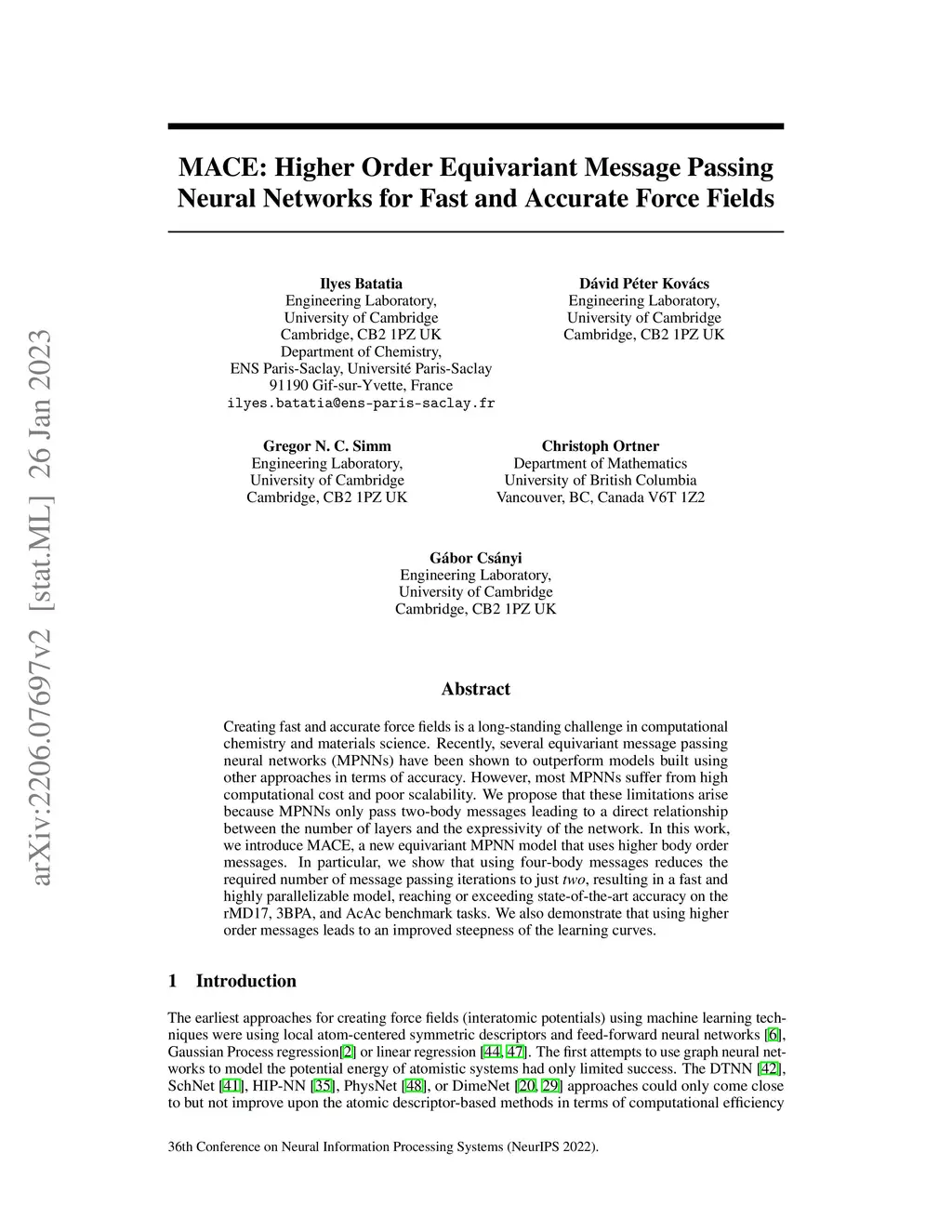 MACE: Higher Order Equivariant Message Passing Neural Networks for Fast