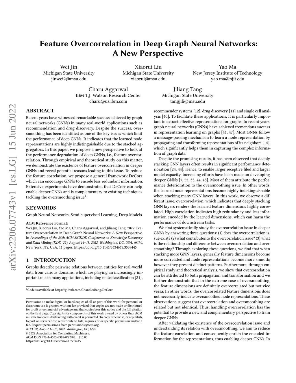 Recent years have witnessed remarkable success achieved by graph neural networks (GNNs) in many real-world applications such as recommendation and drug discovery. Despite the success, oversmoothing has been identified as one of the key issues which limit the performance of deep GNNs. It indicates that the learned node representations are highly indistinguishable due to the stacked aggregators. In this paper, we propose a new perspective to look at the performance degradation of deep GNNs, i.e., feature overcorrelation. Through empirical and theoretical study on this matter, we demonstrate the existence of feature overcorrelation in deeper GNNs and reveal potential reasons leading to this issue. To reduce the feature correlation, we propose a general framework DeCorr which can encourage GNNs to encode less redundant information. Extensive experiments have demonstrated that DeCorr can help enable deeper GNNs and is complementary to existing techniques tackling the oversmoothing issue.