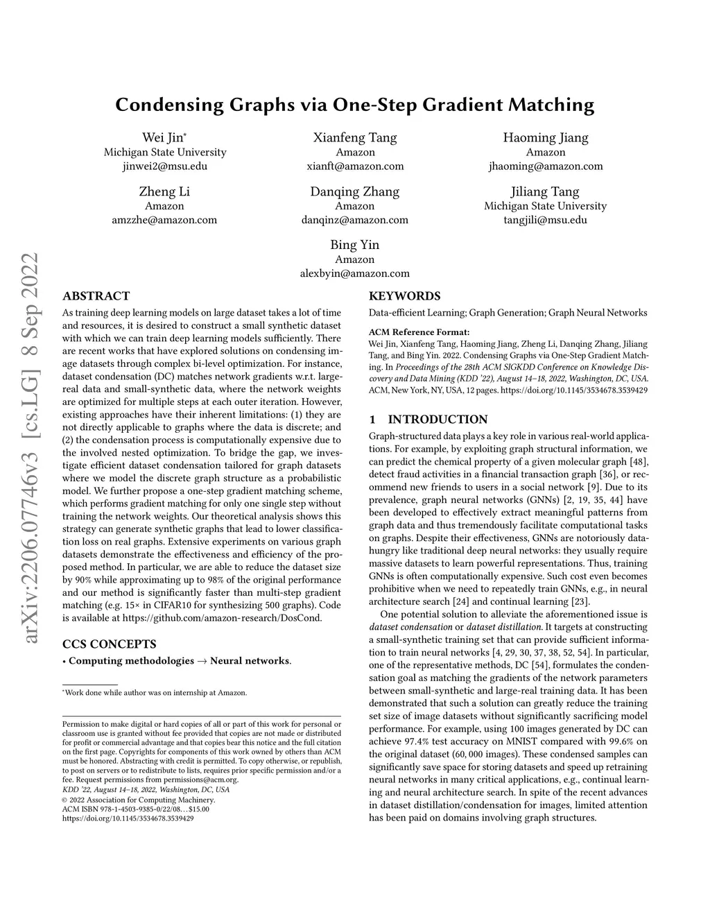As training deep learning models on large dataset takes a lot of time and resources, it is desired to construct a small synthetic dataset with which we can train deep learning models sufficiently. There are recent works that have explored solutions on condensing image datasets through complex bi-level optimization. For instance, dataset condensation (DC) matches network gradients w.r.t. large-real data and small-synthetic data, where the network weights are optimized for multiple steps at each outer iteration. However, existing approaches have their inherent limitations: (1) they are not directly applicable to graphs where the data is discrete; and (2) the condensation process is computationally expensive due to the involved nested optimization. To bridge the gap, we investigate efficient dataset condensation tailored for graph datasets where we model the discrete graph structure as a probabilistic model. We further propose a one-step gradient matching scheme, which performs gradient matching for only one single step without training the network weights. Our theoretical analysis shows this strategy can generate synthetic graphs that lead to lower classification loss on real graphs. Extensive experiments on various graph datasets demonstrate the effectiveness and efficiency of the proposed method. In particular, we are able to reduce the dataset size by 90% while approximating up to 98% of the original performance and our method is significantly faster than multi-step gradient matching (e.g. 15x in CIFAR10 for synthesizing 500 graphs). Code is available at \url{https://github.com/amazon-research/DosCond}.
