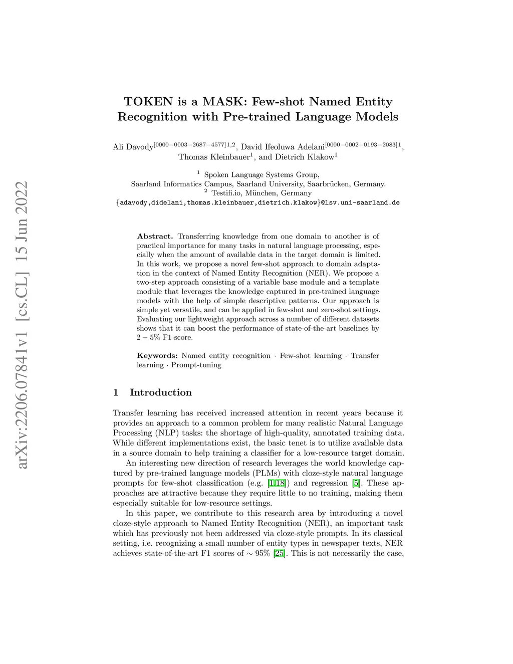 TOKEN is a MASK: Few-shot Named Entity Recognition with Pre-trained