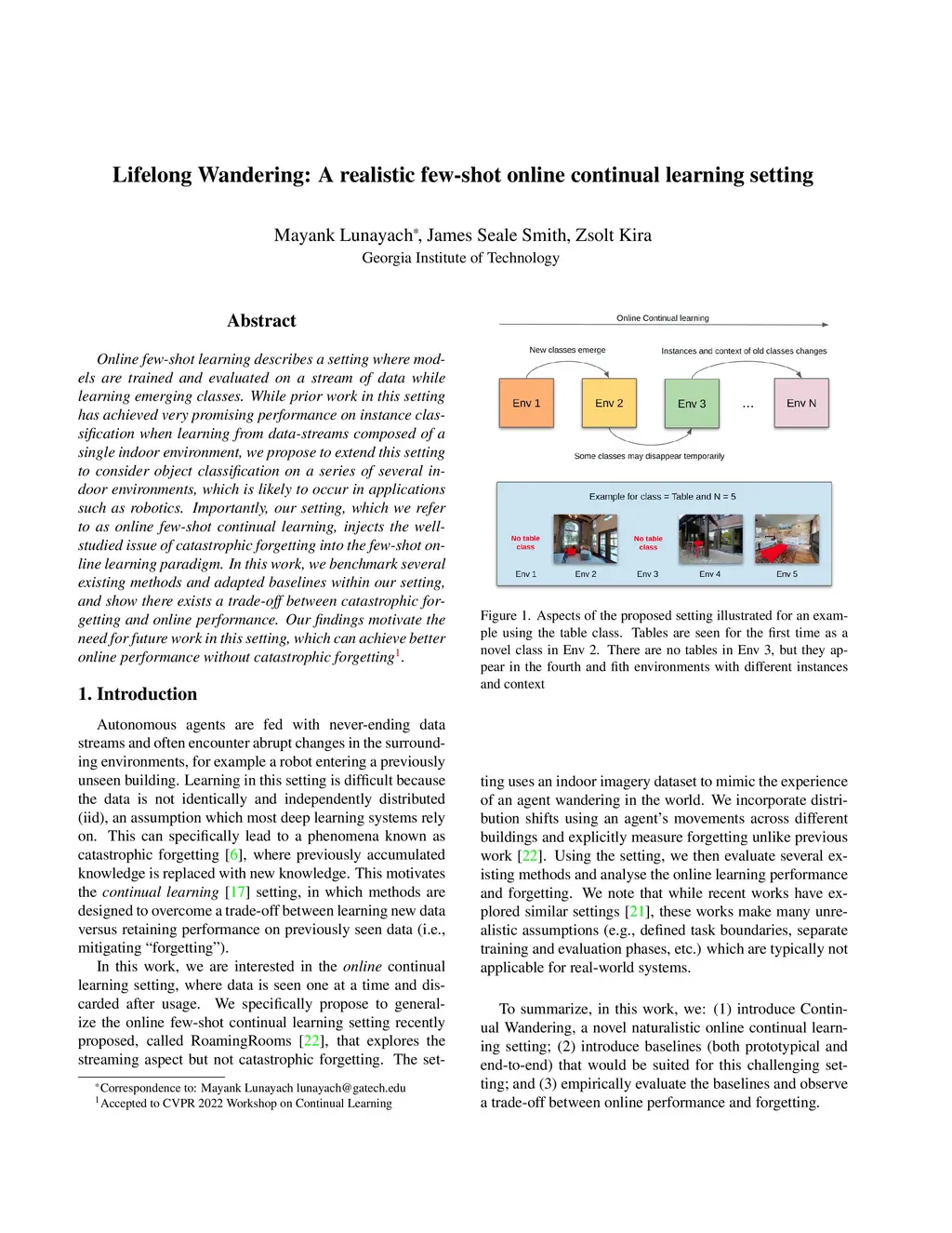 Online few-shot learning describes a setting where models are trained and evaluated on a stream of data while learning emerging classes. While prior work in this setting has achieved very promising performance on instance classification when learning from data-streams composed of a single indoor environment, we propose to extend this setting to consider object classification on a series of several indoor environments, which is likely to occur in applications such as robotics. Importantly, our setting, which we refer to as online few-shot continual learning, injects the well-studied issue of catastrophic forgetting into the few-shot online learning paradigm. In this work, we benchmark several existing methods and adapted baselines within our setting, and show there exists a trade-off between catastrophic forgetting and online performance. Our findings motivate the need for future work in this setting, which can achieve better online performance without catastrophic forgetting.